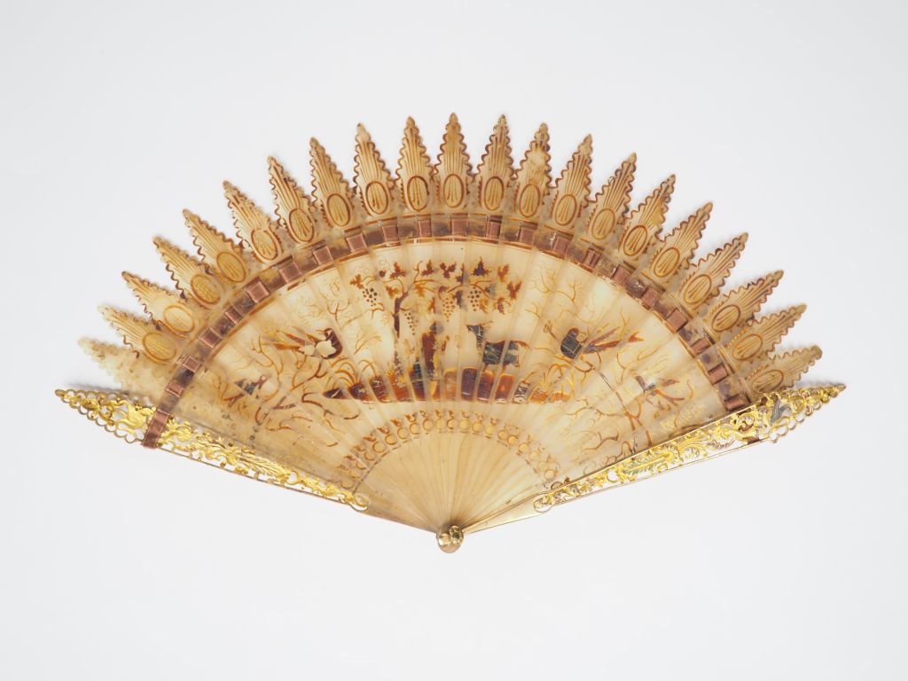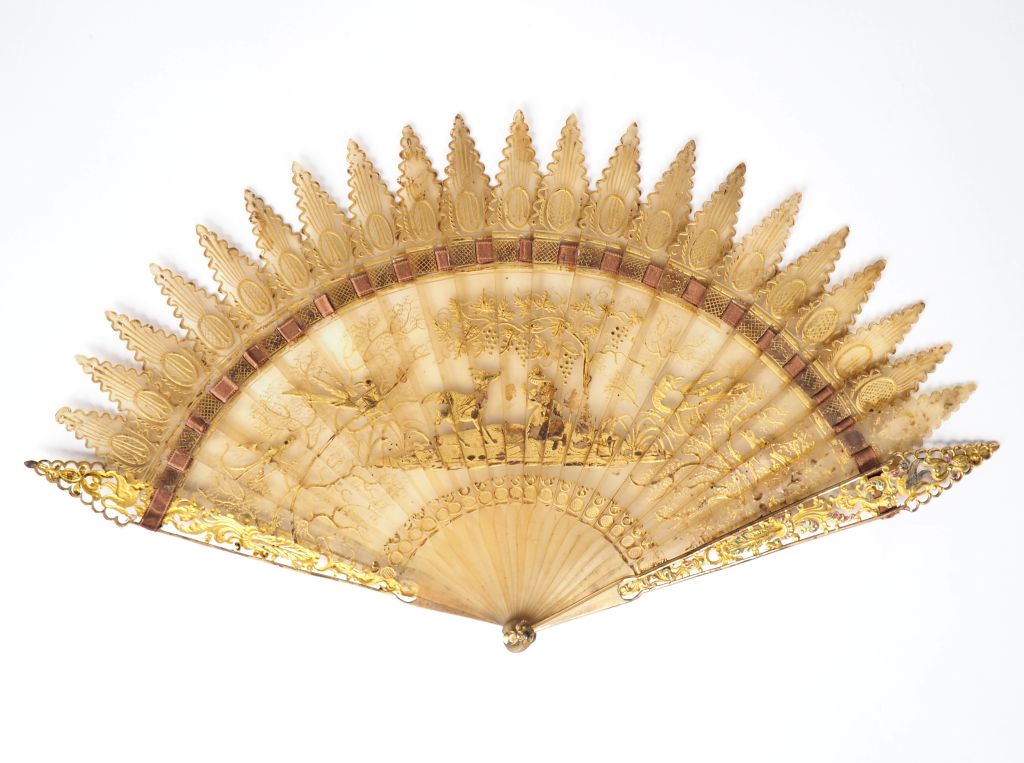 Eventail à feuilles brisées à 20 brins + 2 MB. Monture et brins en corne blonde décoré à l'or. Scène d'une jeune fille avec sa chèvre sous un cep de vigne avec ses raisins, oiseau dans les branches. Monture métallique ajourée à décor de feuillage stylisé et d'un cygne. L'ensemble doré à l'or fin. 19 cm
