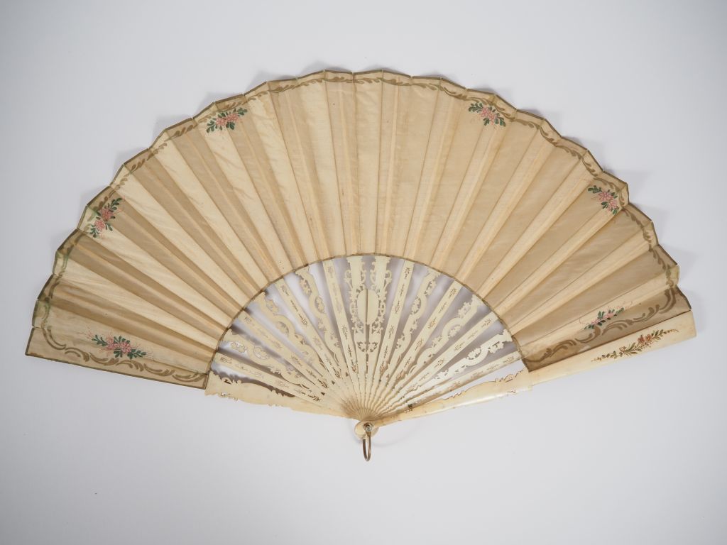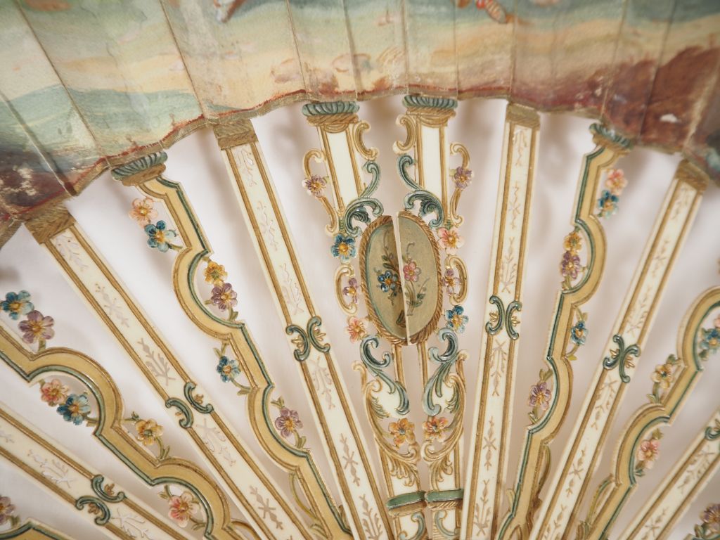 Eventail à feuilles pliées fin XVIIIème. Monture en ivoire ajouré et polychrome. Gouache figurant une scène galante. CITES.