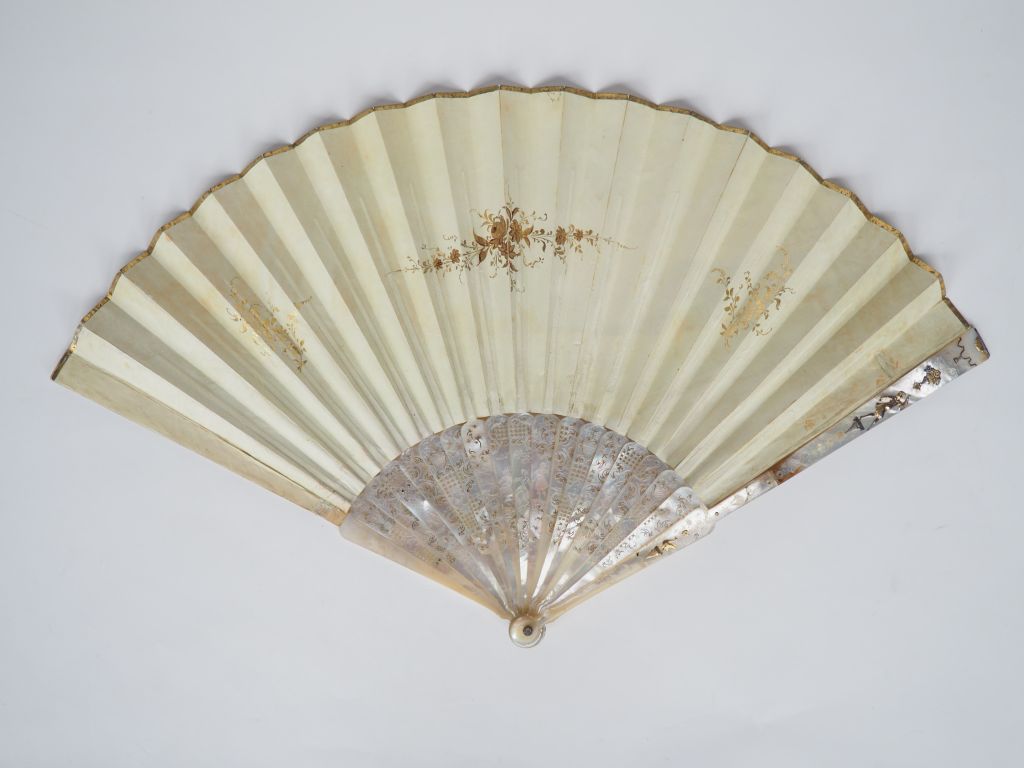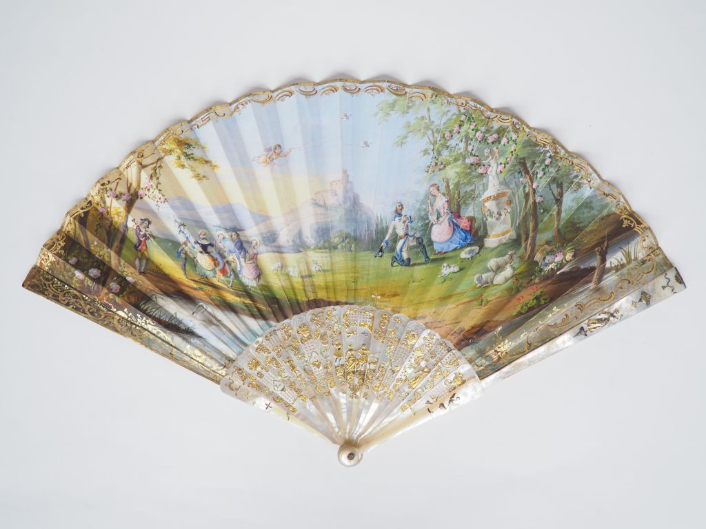 Eventail de Fiançailles XVIIIème à 19 brins en nacre sculptée, ciselée, repercée à décor de personnages et rinceaux réhaussé d'or. Feuille gouachée aux couleurs très fraiches. "Déclaration d'amour" sur fond de paysage romantique animé d'un groupe de danseurs.