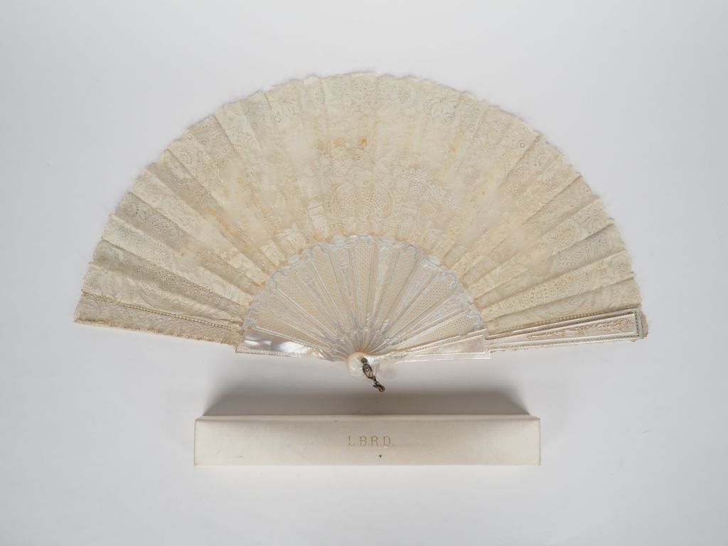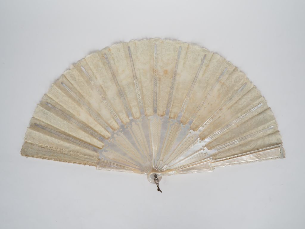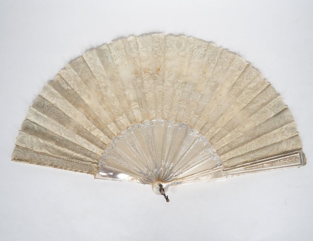 Eventail de mariage XIXème à 13 brins + 2 MB. Monture en nacre finement repercée et sculptée. Travail d'une très grande finesse. Feuille splendide point à l'aiguille de qualité exceptionnelle. Dans un écrin signé Duvelleroy. 29 cm