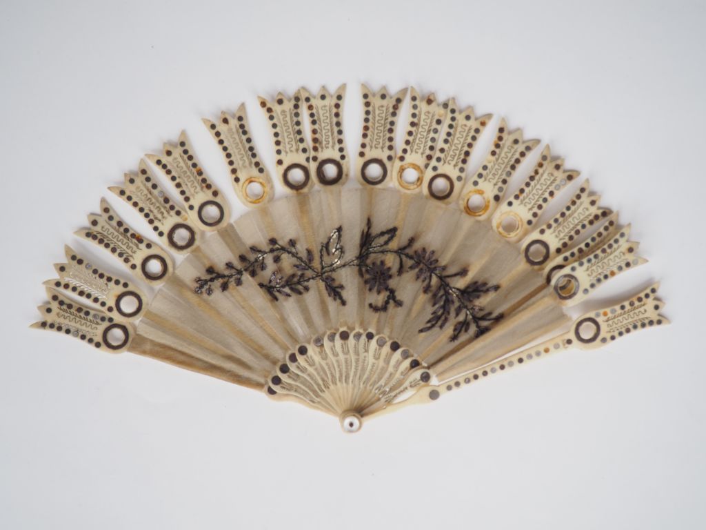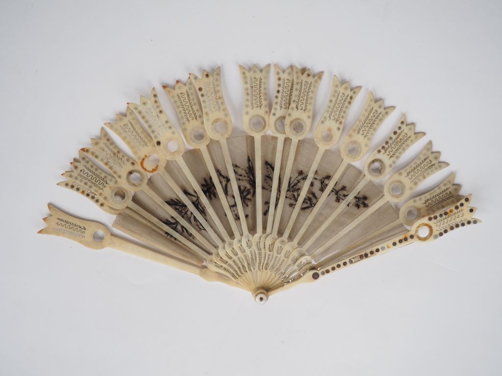 Eventail début XIXème en ivoire et soie brodée, décor de feuillage. 17 brins en forme de tulipe. (Petits accidents). CITES.