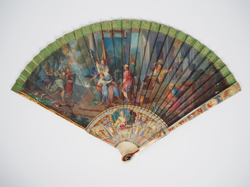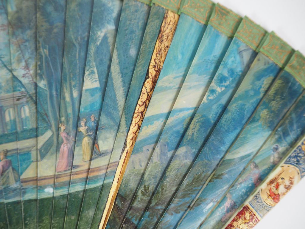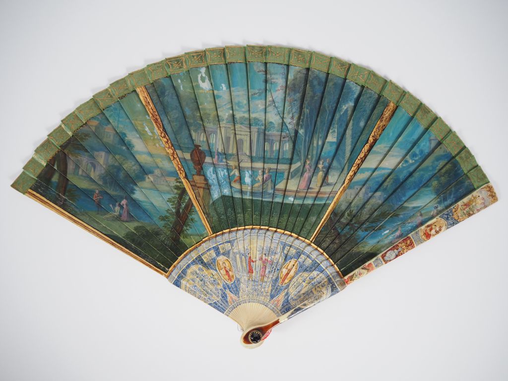 Eventail début XVIIIème à feuilles brisées, 29 brins. Monture en ivoire, décor au vernis. Scène allégorique. Au dos, scène de parc animé de personnages autour d'une pièce d'eau. Gorge à décor de portrait de femme. CITES.