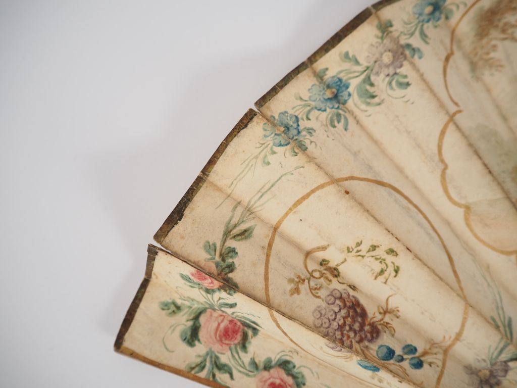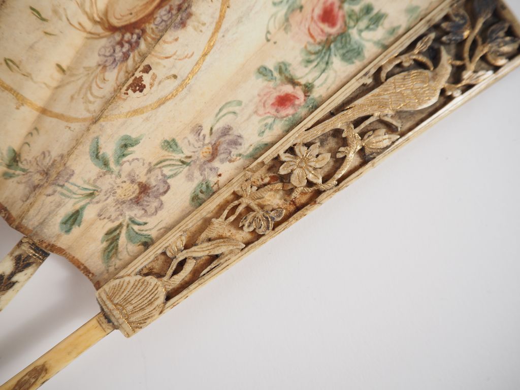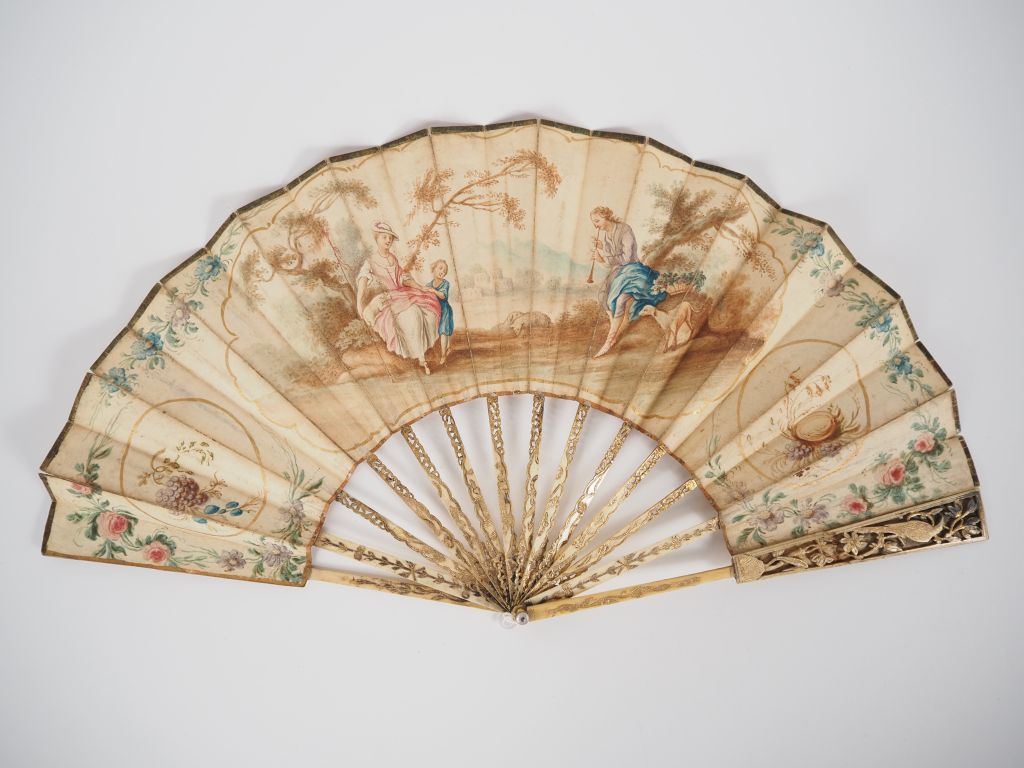Eventail fin XVIIIème à 12 brins + 2 MB, en ivoire ajouré et doré. Décor de feuillage et d'oiseaux. Aquarelle figurant une scène bucolique. CITES.