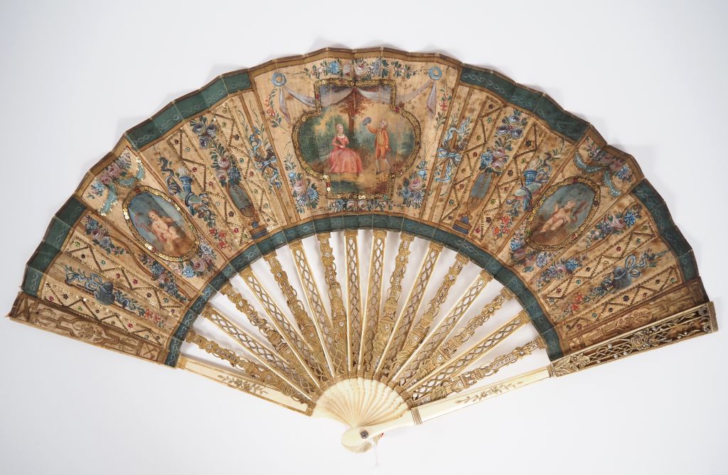 Eventail Louis XVI à feuilles pliées, 16 brins +2MB. Monture en ivoire finement sculptée à décor de balustres alternant avec des brins ajourés d'entrelacs. Réhaussé d'or bronzé. Feuilles gouachée sur soie, pailletée, compartimentée de vases de fleurs, attributs de l'amour. Médaillon central : déclaration d'amour sous un arbre. Médaillons latéraux chérubins. (Manque. Soie piquée au verso). CITES