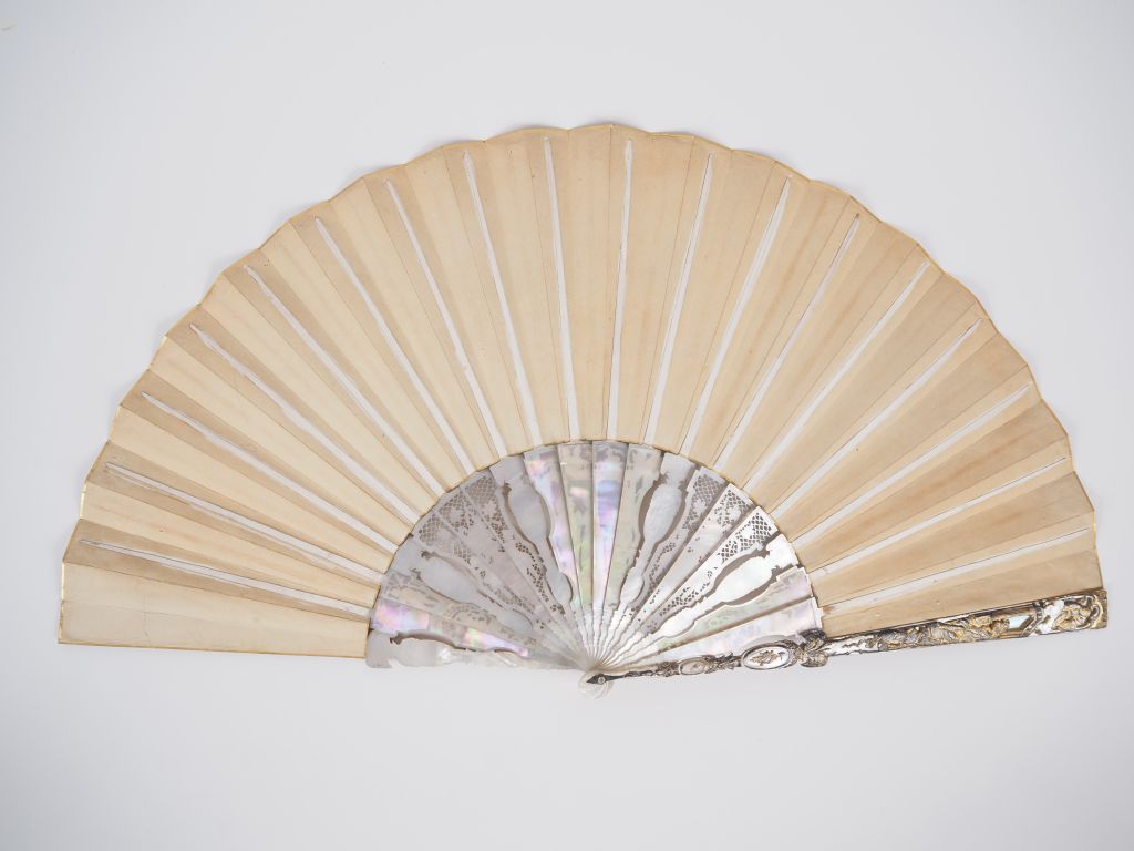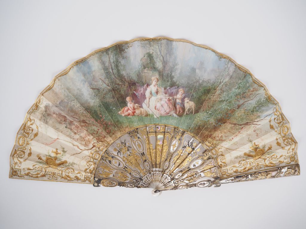 Eventail. Monture nacre burgautée finement sculptée, ciselée et repercée. 20 brins. Motif central à décor de trois personnages sur fond architectural rehaussé d'or. Médaillons et vases fleuris avec angelots, motifs latéraux à décor de personnages et d'angelot, rehaussé d'or. Feuille pleine vol. Dans son écrin Alouise Van de Voorde.