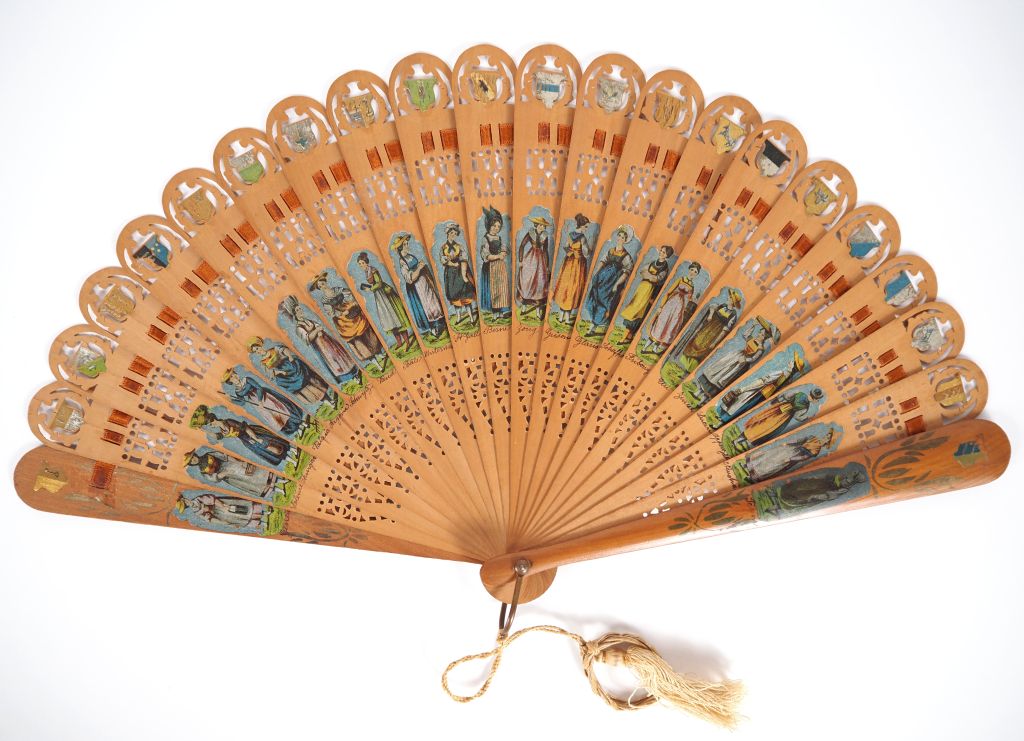 Eventail "Plein vol" circa 1950 à 20 brins + 2 MB. Monture en bois, repercée à décor d'écussons et de costumes féminins des 22 cantons de la confédération helvétique.