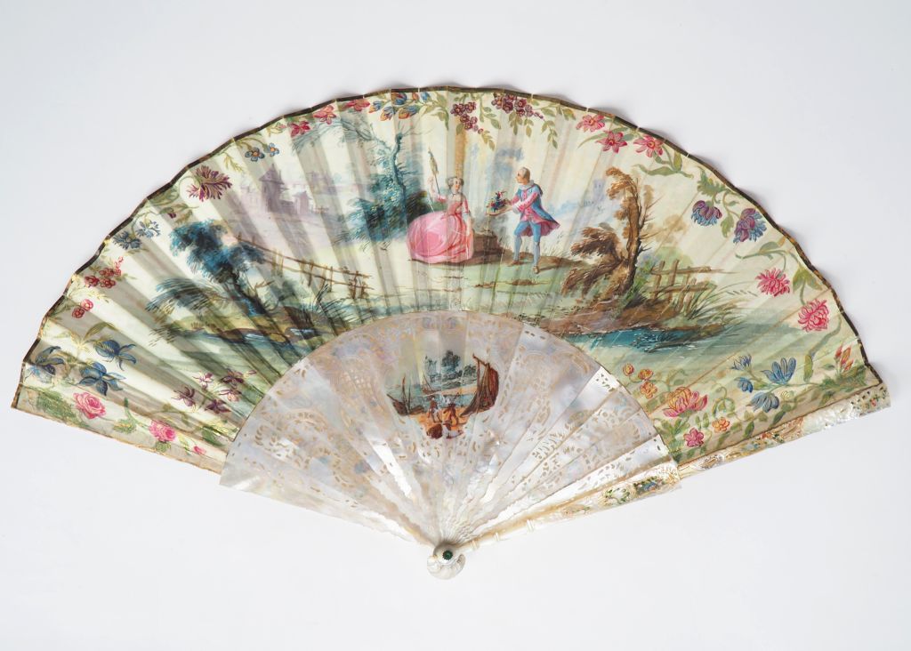 Eventail plein vol Louis XV. Monture en nacre repercée et peinte d'une scène figurant Neptune et Vénus. 20 brins + 2 MB. Feuille en parchemin peint d'une scène bucolique avec des jeux d'enfants dans une bordure avec volatiles et écureuil.