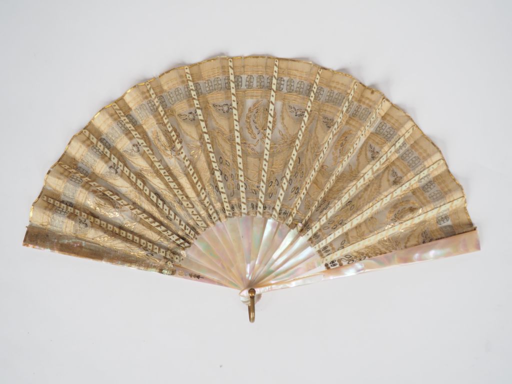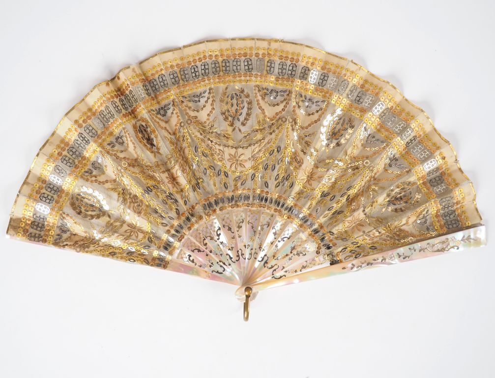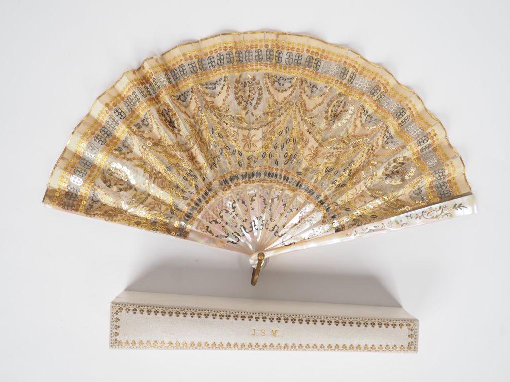 Eventail premier Empire à feuilles pliées. 14 brins + 2MB. Monture en nacre très brillante, gravée, réhaussée d'or. Feuille pailletée, or mat, or brillant et acier. Sur gaze à décor de draperies er couronnes de laurier.18,5 cm. Avec écrin APPAY JSM.