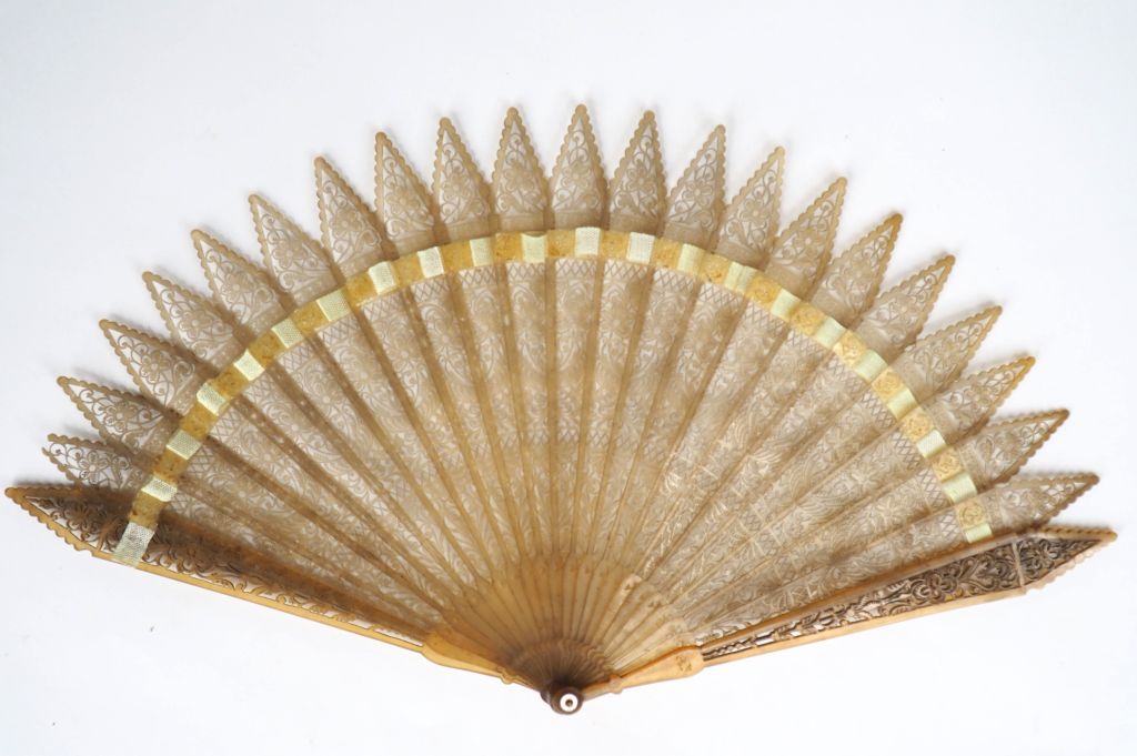 Eventail Restauration à feuilles brisées. Corne blonde finement repercée à décor de fleurs et de draperies. (Usures).