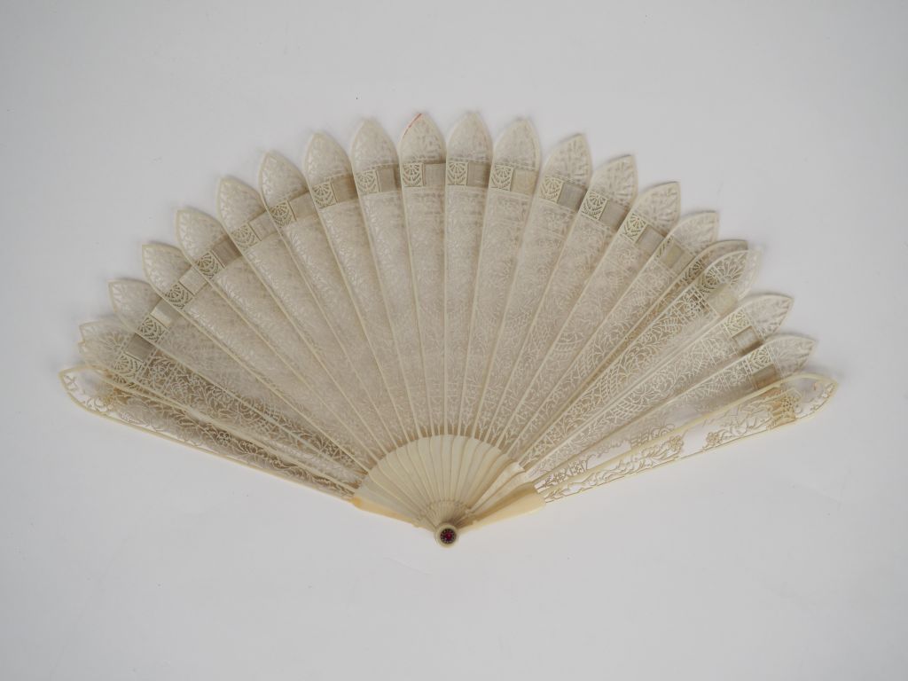 Eventail Restauration, à feuilles brisées. Ivoire repercé, à décor de fleurs et de rinceaux. (Ruban déchiré, manques). CITES.
