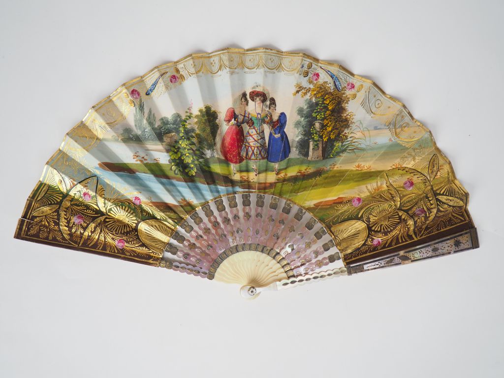 Eventail romantique XIXème à 16 brins + 2 MB. Monture en ivoire contrecollée de nacre repercée et dorée. Feuille gouachée "groupe de trois jeunes filles dans un parc". Au verso "l'amour perce deux coeurs d'une flèche au centre d'une couronne". 19 cm. CITES.