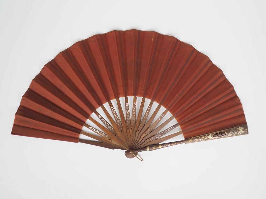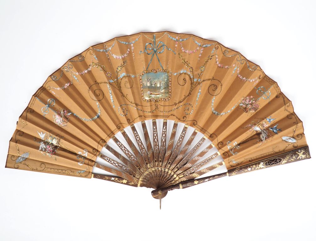 Eventail vers fin XIXème à 16 brins + 2MB. Monture en palissandre, sculptée, repercée avec incrustations d'or. Feuille de taffetas gouaché, pailleté dans l'esprit Louis XVI. Signé LESIEUR.