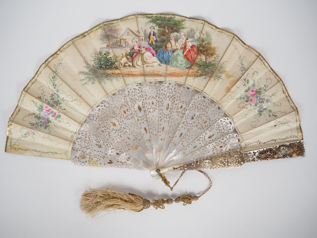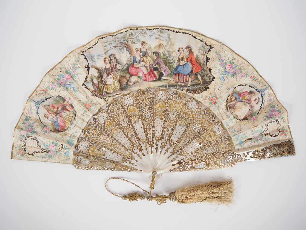 Eventail XIXème à 12 brins + 2 MB. Monture en nacre."Plein Vol". Gorge très importante. Finement gravée et repercée. Décor réhaussé d'or de fleurs, de rinceaux sur fond grillagés et de croisillons. Feuille gouachée sur soie. Grand médaillon central à décor de scène pastorale.