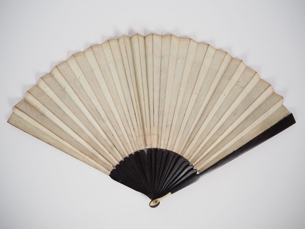 Eventail XIXème à 17 brins +2 MB, palissandre et os. Feuille lithographiée et rehaussée "la Reine Elisabeth dans un parc où l'on voit le Comte d'Essex offrant à la Reine son bras afin qu'elle ne se mouille pas le pied". 24 cm.