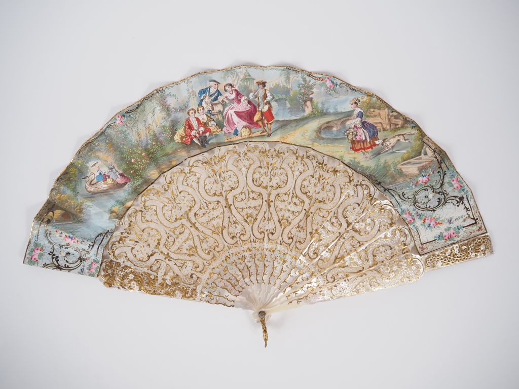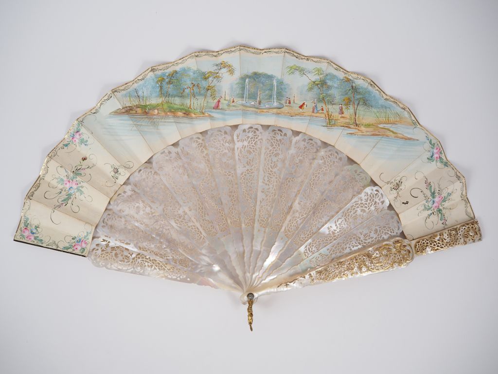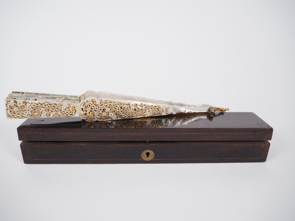 Eventail XIXème à feuilles pliées. 12 brins +2MB. Monture exceptionnelle en nacre repercée. Veritable dentelle. Decor de fleurettes et de rinceaux finement ajouré réhaussé d'or. Feuille gouache. Ecrin en palissandre et filets de cuivre.