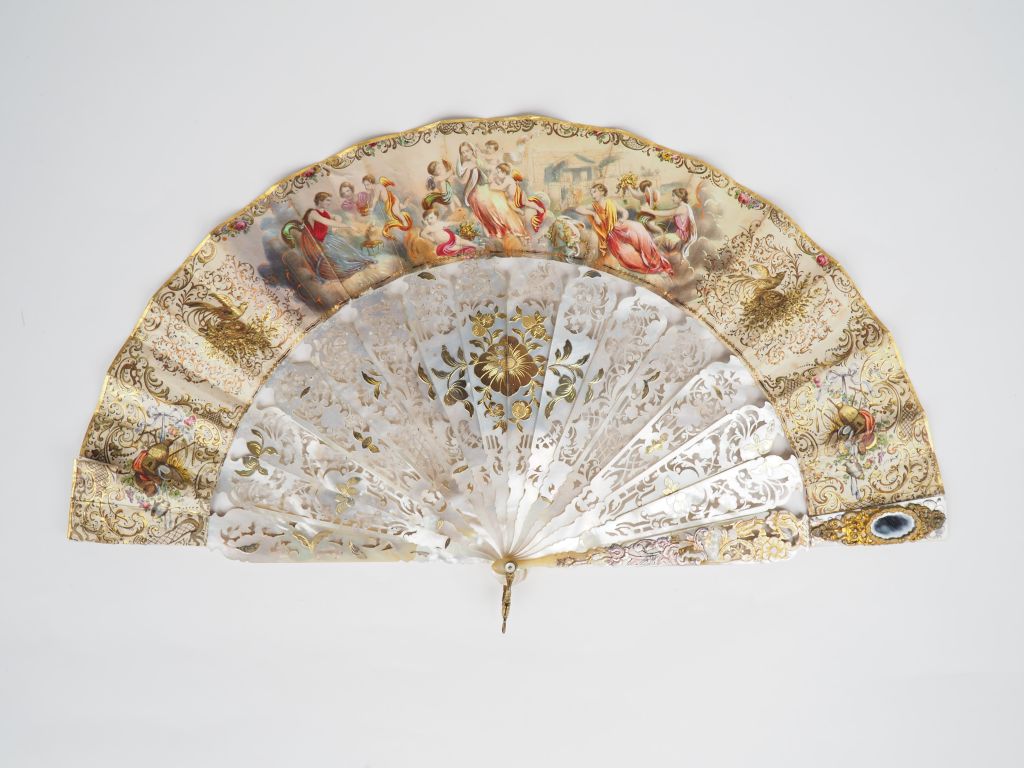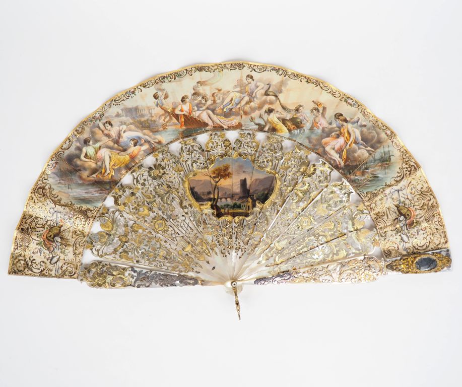 Eventail XIXème circa 1850 à 14 brins + 2 MB. Espagnol. Monture en nacre blanche entièrement ciselée et ajourée avec un médaillon central peint "paysage romantique". L'ensemble doré à la feuille d'or et Maitre Brin argent et or. Au verso : décor de fleur polychromées rehaussées d'or. Ecrin vert avec applique cuivre. 37 cm. (accident)