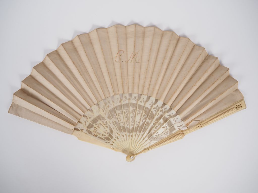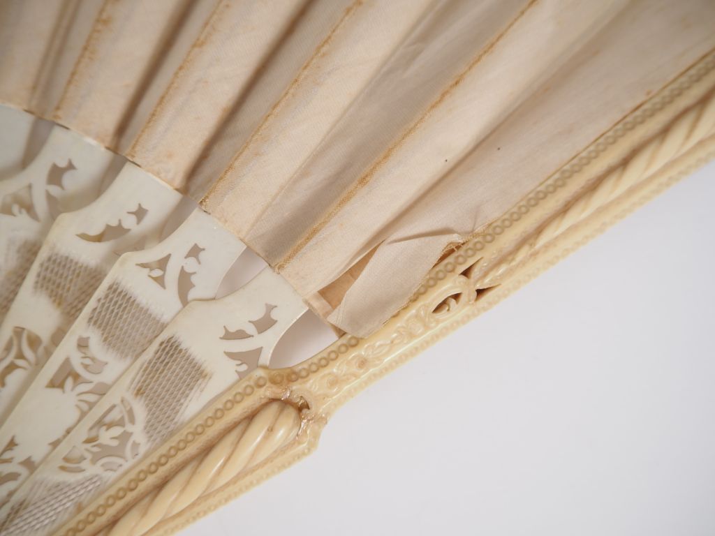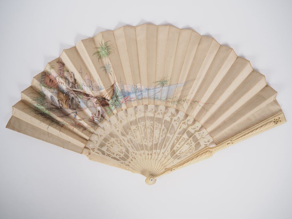 Eventail XIXème circa 1870 à 16 brins + 2 MB. Ivoire sculpté, monture jointive repercée et finement grillée. Feuille satin peinte asymétriquement d'une vue de ville orientale "le Caire" et d'une vaste étendue d'eau. Signé. 27 cm. (accident sur un maître brin) CITES.