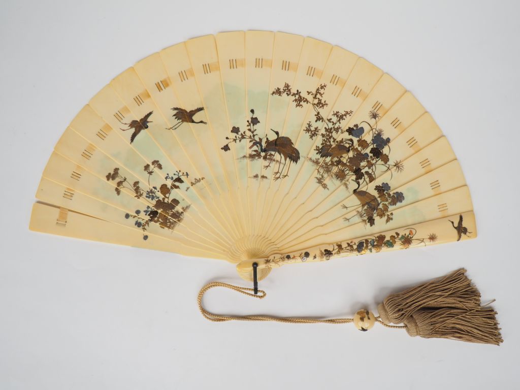 Eventail XIXème Japon circa 1880 en ivoire brisé à 20 brins + 2 MB, en laque dorée et argentée avec applications de nacre, ivoire, corail, jade. Recto : village de pêcheur relevant les filets, moutons dans le lointain. Verso : décor de grues en vol ou évoluant parmi des plantes et des arbustes fleuris. Maitres Brins décorés de feuillage et de grue. Eventail extraordinaire. CITES