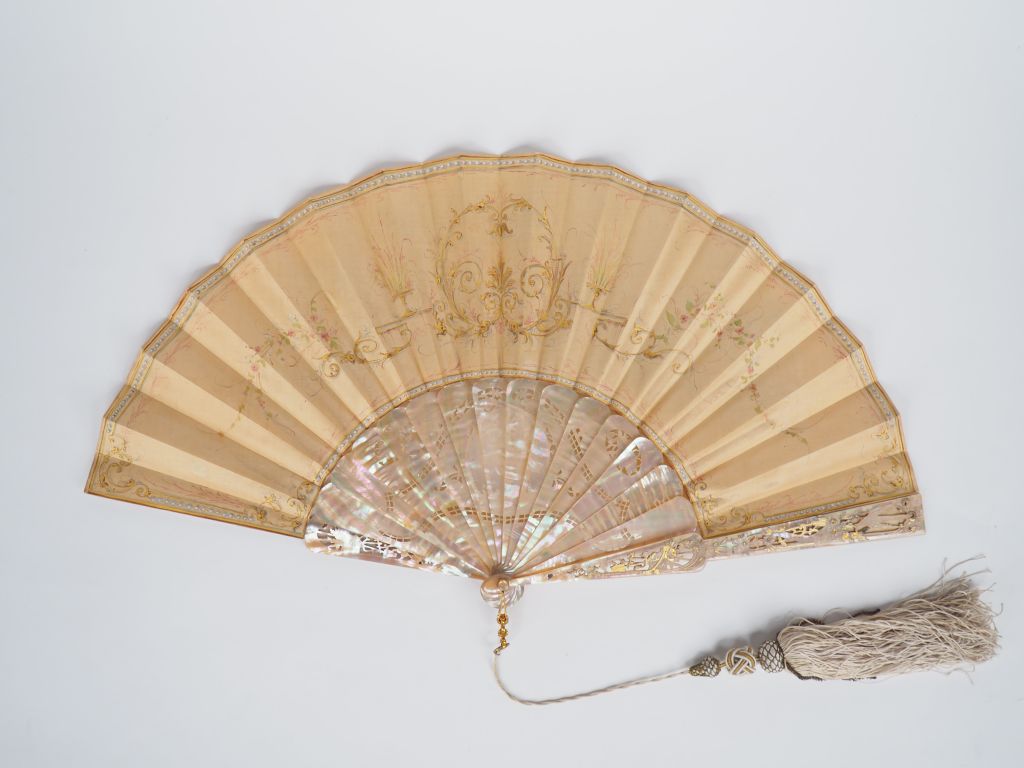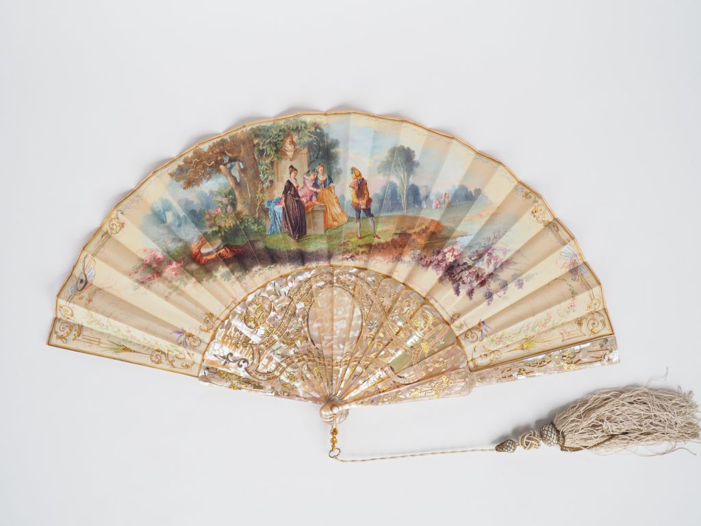 Eventail XIXème. Monture à 16 brins en nacre ciselée, repercée et réhaussée d'or. Decor de corbeilles de fleurs et de rinceaux. Médaillon central burgauté. Cor de Chasse, faisans, jolie belière en starss et gland en soie. Feuille Plein Vol. Aquarelle sur soie. "scène champêtre galante". Contre feuille soie. Encadrement de rinceaux, fleurs et thèmes musicaux avec un écrin gainé de cuir, dessus en glace biseautée.