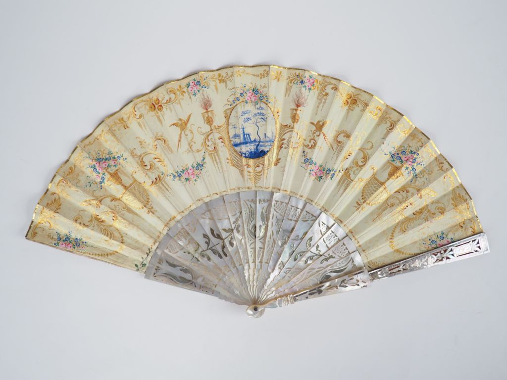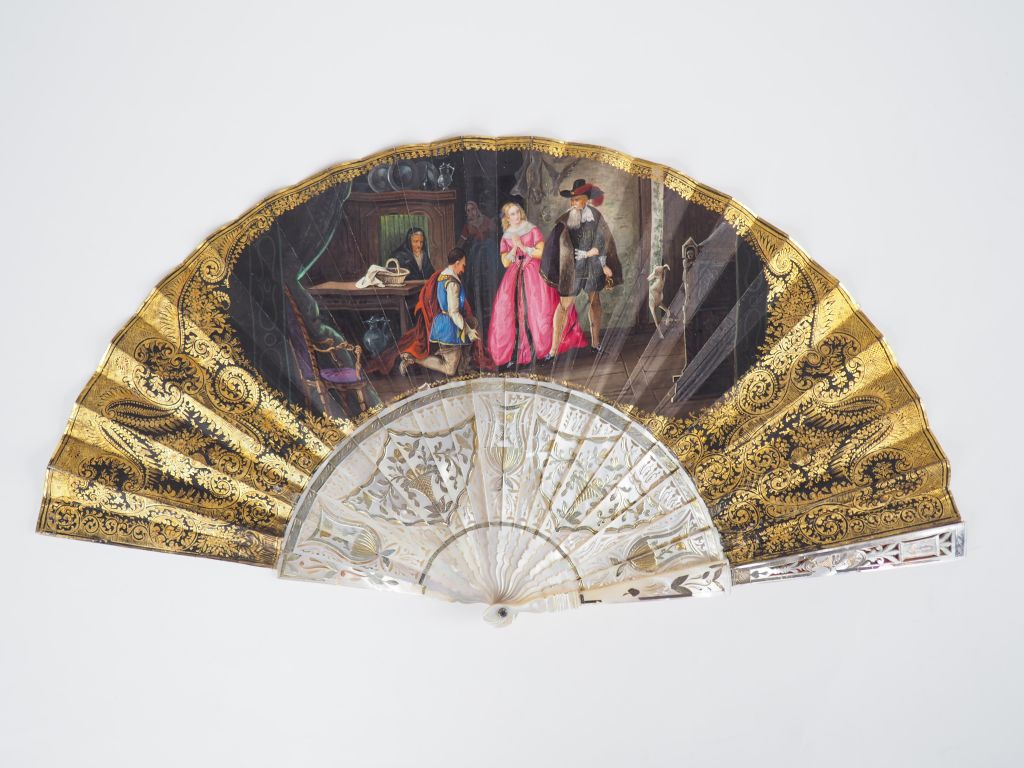 Eventail XIXème. Monture à 20 brins en nacre ajourée, ciselées et dorées à décor de médaillons et de vases fleuris. Feuille plein vol gouachée d'une scène du XVIème "le refus" Magnifique cadre à décor d'or sur fond noir. Contre feuille en velin à décor de rinceaux doré, de vases et de guirlandes de fleurs polychromes, médaillon central en camaieu bleu.