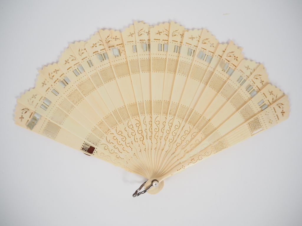 Eventail XIXème siècle à feuilles brisées à 18 brins + 2 MB.. Monture en ivoire. Maître brin à décor d'un médaillon raporté imitant la laque de Pekin. (manques) CITES.