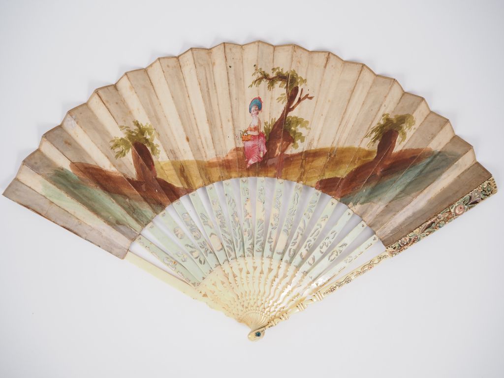 Eventail XVIIIème. 16 brins + MB. Monture ivoire repercée, décor de roses et œillets sur fond bleu. Maitre Brin décoré de fleurs, Vernis Martin. Feuille gouachée "déclaration d'amour dans un parc". 26 cm. CITES.
