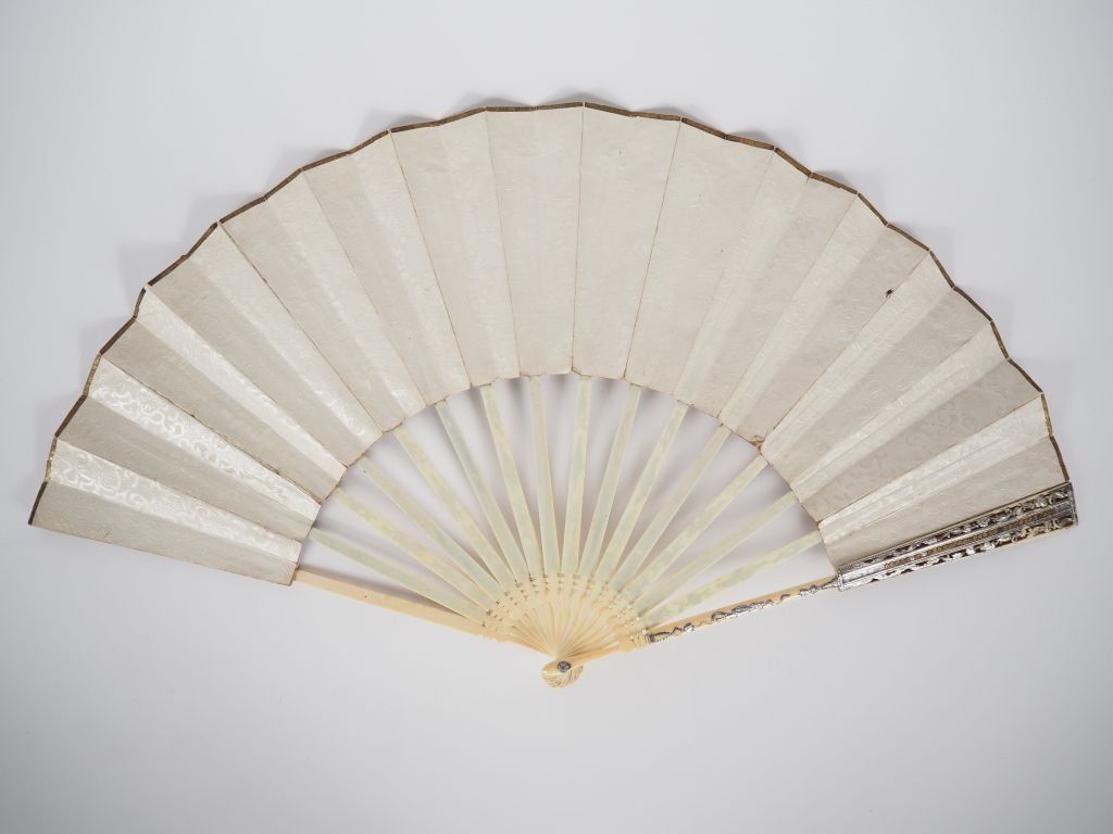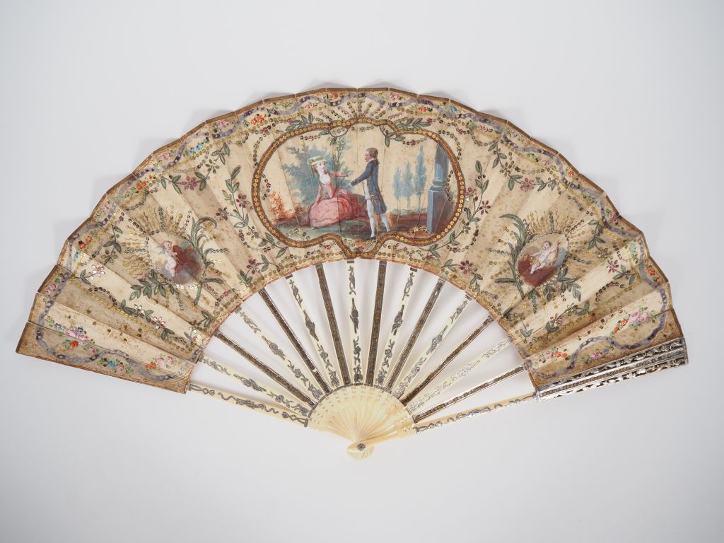 Eventail XVIIIème. 16 brins, monture type squelette en ivoire, ciselée, incrustée d' argent et paillettée d'or. Feuille gouachée, chenillée et pailletée sur soie, décor de trois cartouches. Motif central "scène galante". Médaillons latéraux "angelots". CITES.