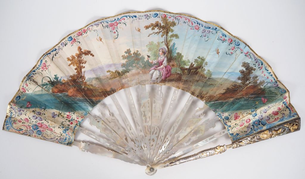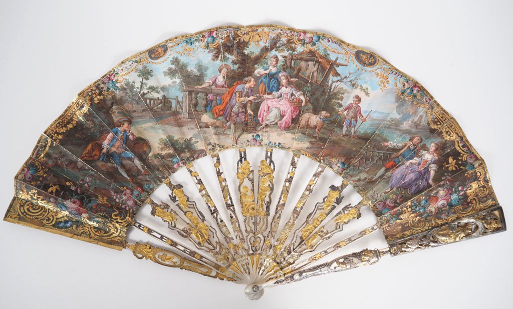 Eventail XVIIIème à 14 brins en nacre gravée ajourée et dorée à décor d'amours, d'enfants et de trophée. Gouache figurant une scène galante bucolique.