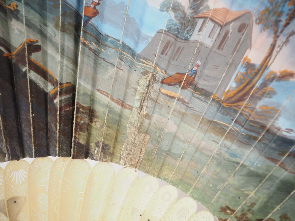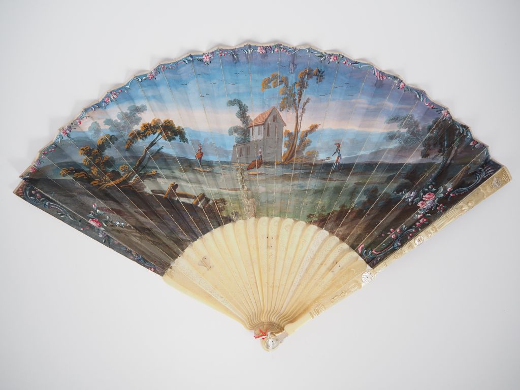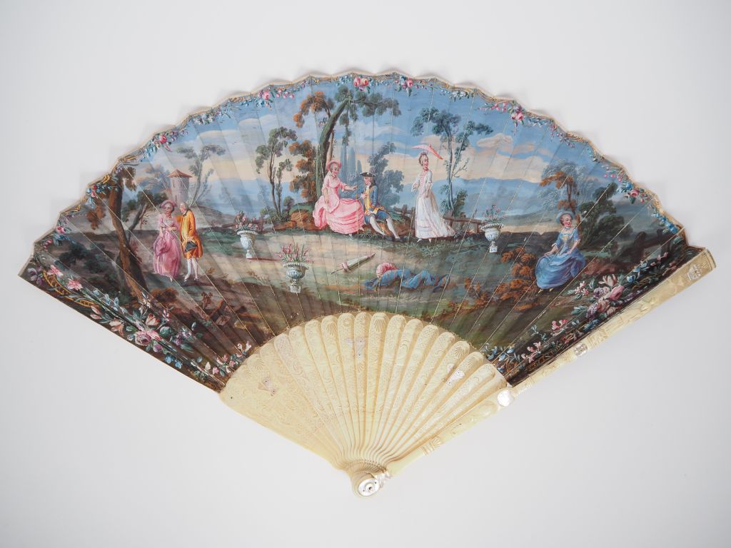 Eventail XVIIIème à 19 brins + 2 MB. Monture en ivoire finement sculptée et repercée à décor de coupe en nacre. Maître Brin réhaussé de quatres applications en nacre, finement gravée une jeune fille. Feuille gouachée, au recto : déclaration d'amour dans un parc, au verso : paysage. CITES.