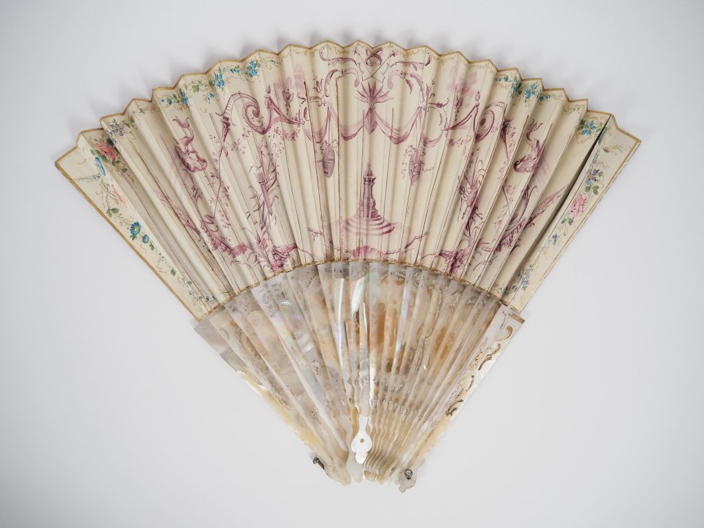 Eventail XVIIIème, à 20 brins + 2 MB.. Monture en nacre finement gravée, sculptée, burgautée et réhaussée d'or. Décor de rocailles. Grand médaillon central : enlèvement d'Amphitrite par Neptune. Médaillons latéraux animés de personnages. Feuille gouachée figurant le char de Bacchus tiré par deux lions avec hommes et femmes s'ébattant joyeusement dans un décor champêtre. (Accidents).