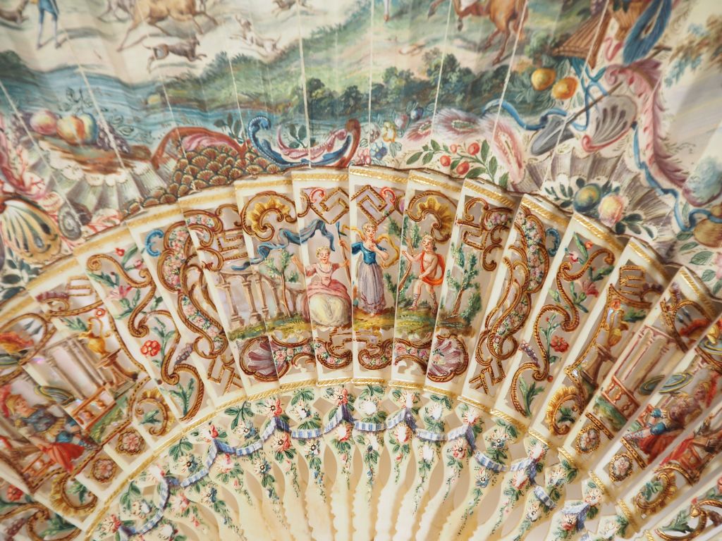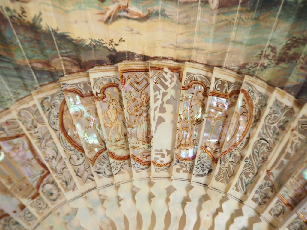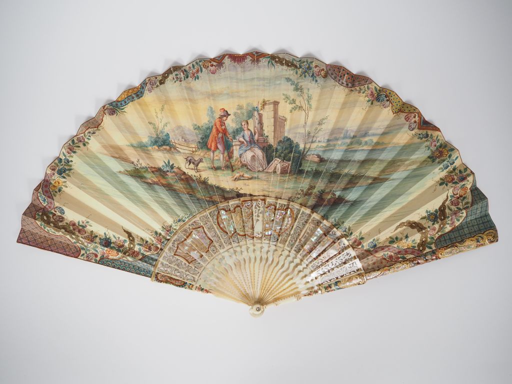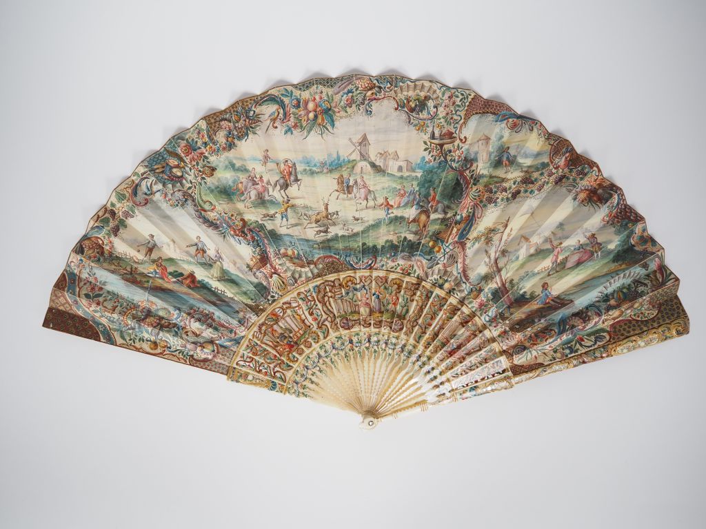 Eventail XVIIIème à feuilles pliées. Monture en ivoire ajouré et peint, à décor de personnages dans trois réserves sur fond burgoté. Gouache sur parchemin. Recto : dans quatre réserves scène de chasse et personnages jouant. Verso : scène galante d'un couple de chasseurs. CITES