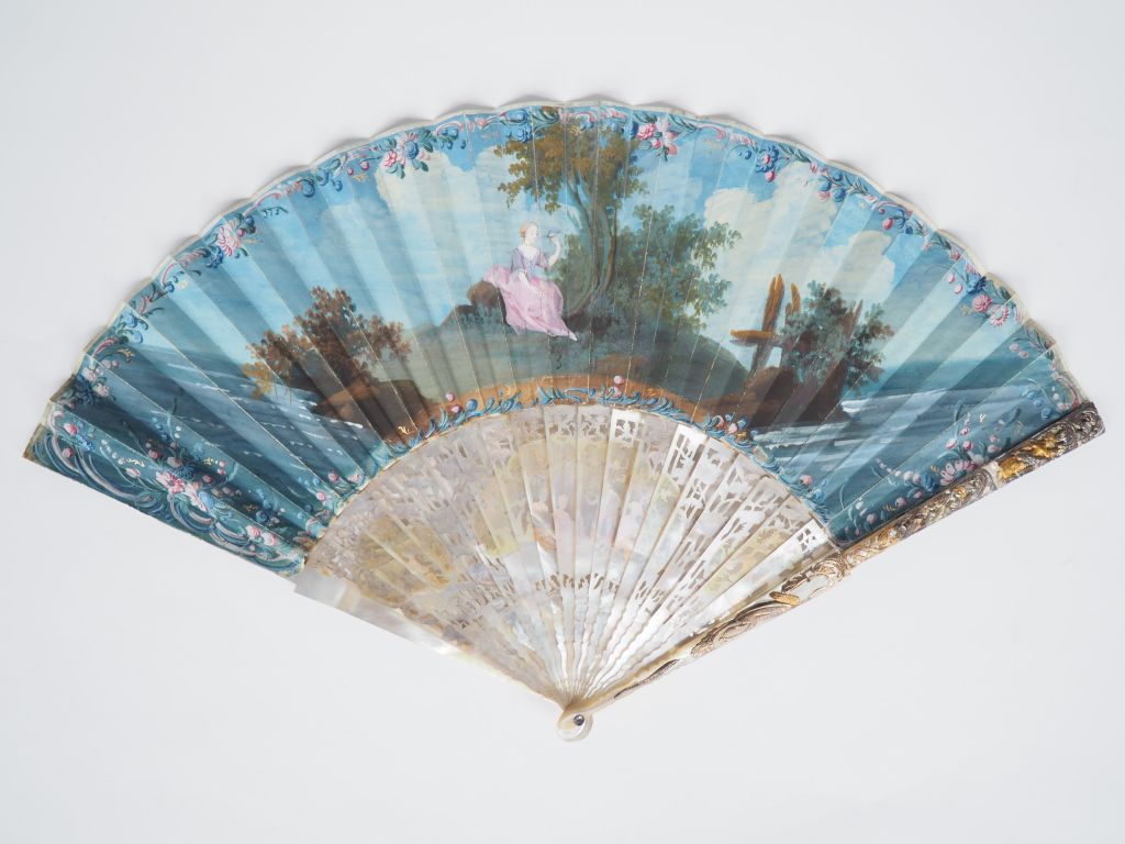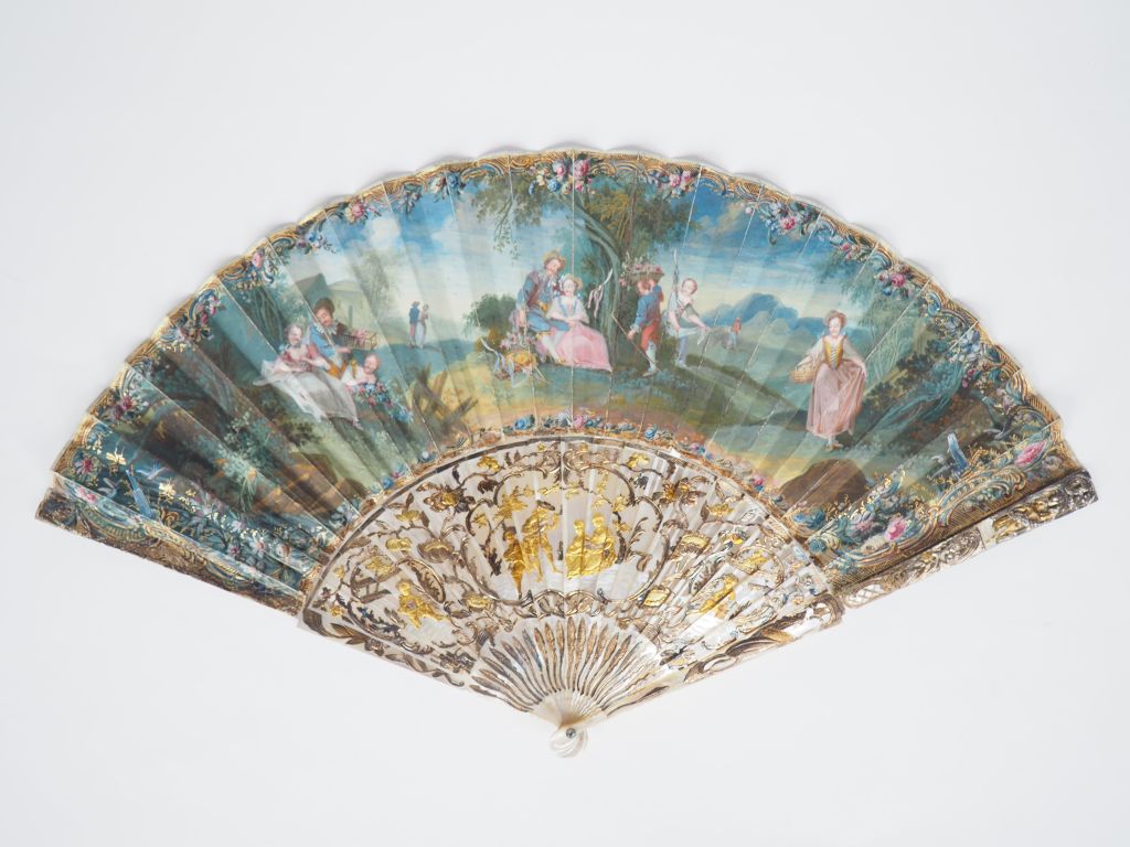 Eventail XVIIIème circa 1780, 20 brins + 2 MB. Monture en nacre repercée, sculptée, burgotée et incrustée d'or. Orné de trois cartouches représentant des distractions musicales.Feuille en cabretille. Au centre scène galante avec berger et bergère. Sur la gauche un jeune homme offre des oiseaux à une jeune fille. Au verso : une jeune fille écoute le chant du rossignol.