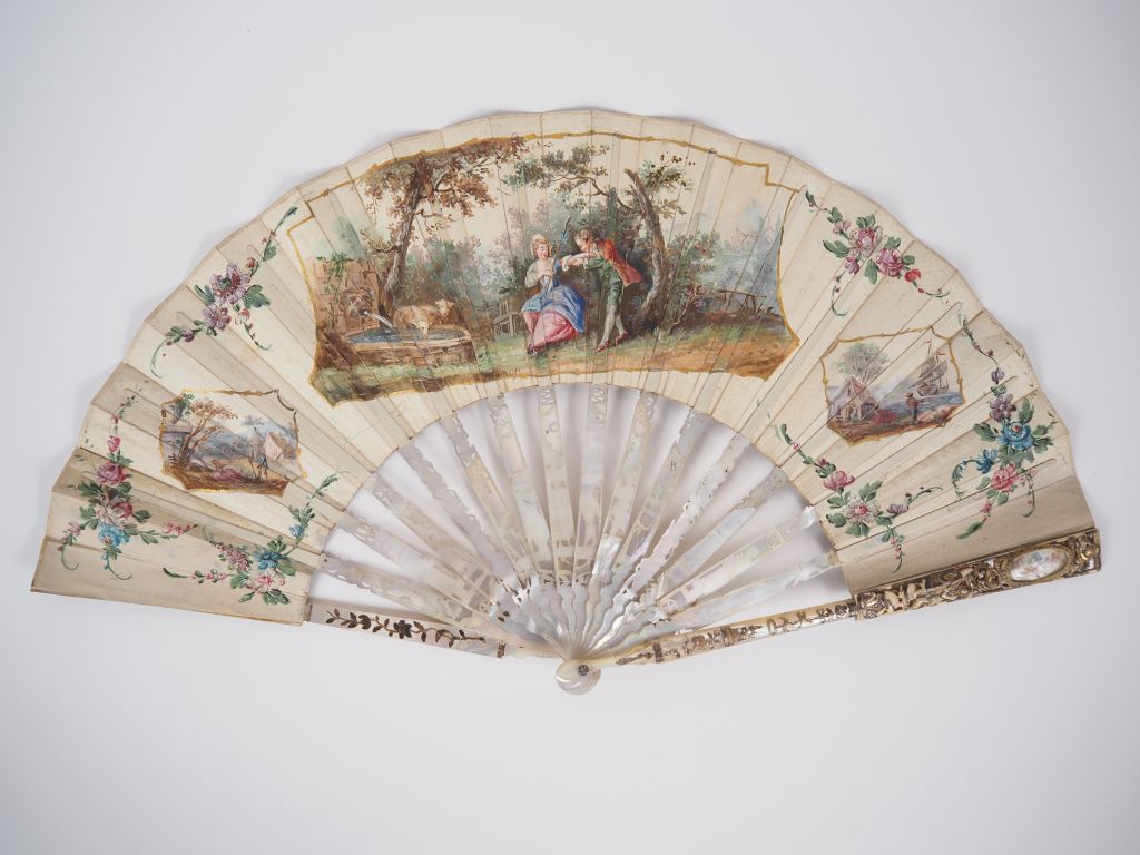 Eventail XVIIIème en nacre ajourée, argentée et dorée. Décor de personnages présentant des offrandes à l'amour. Feuille pliée ornée d'une gouache sur le même thème. Deux réserves en plumes à décor de fleurs et d'oiseaux.
