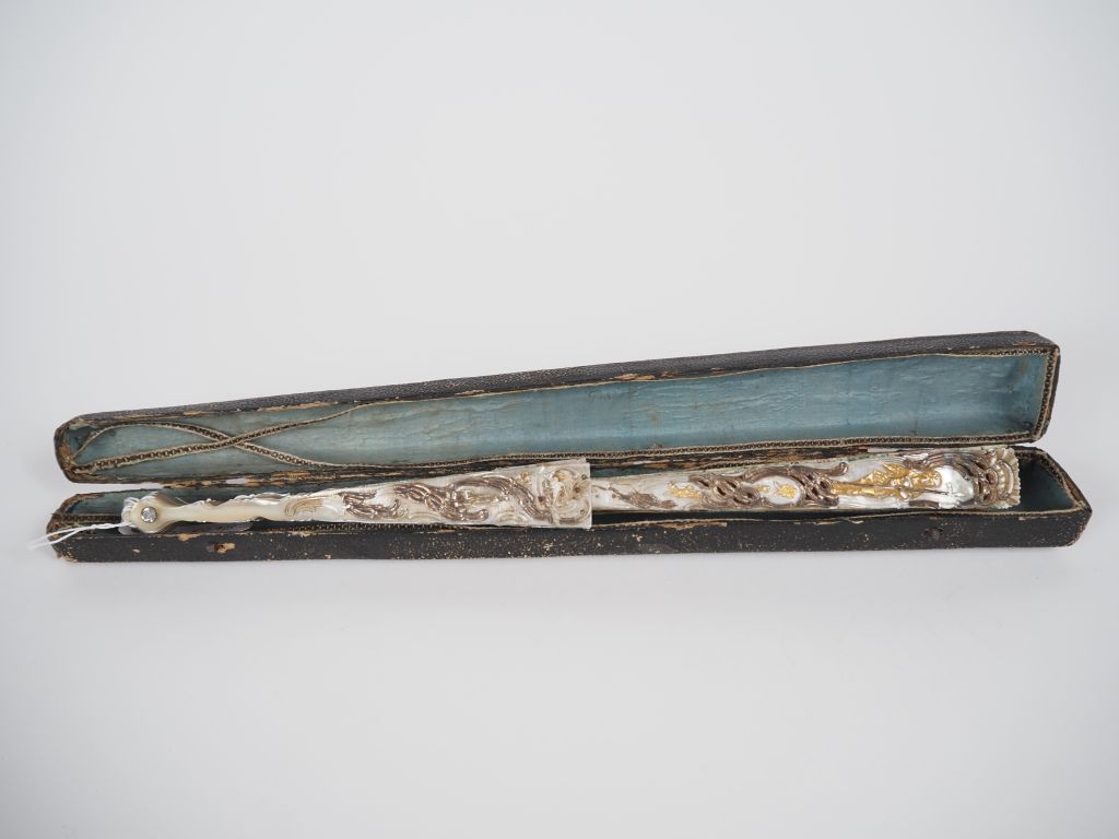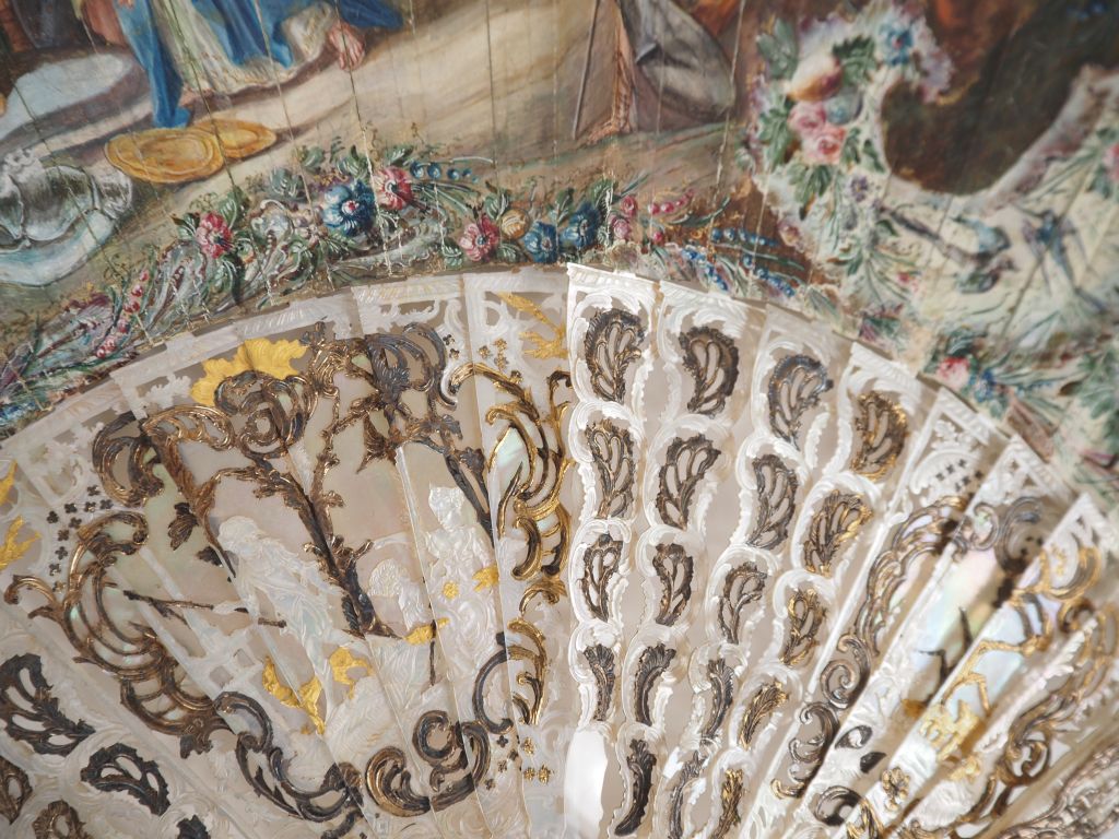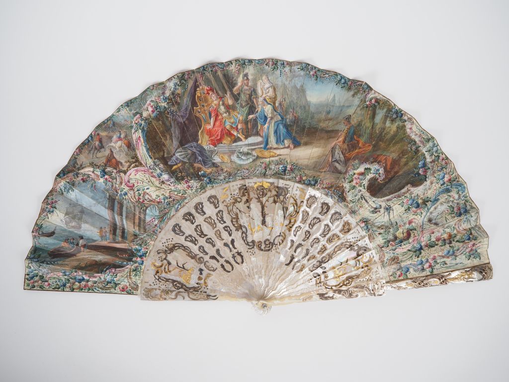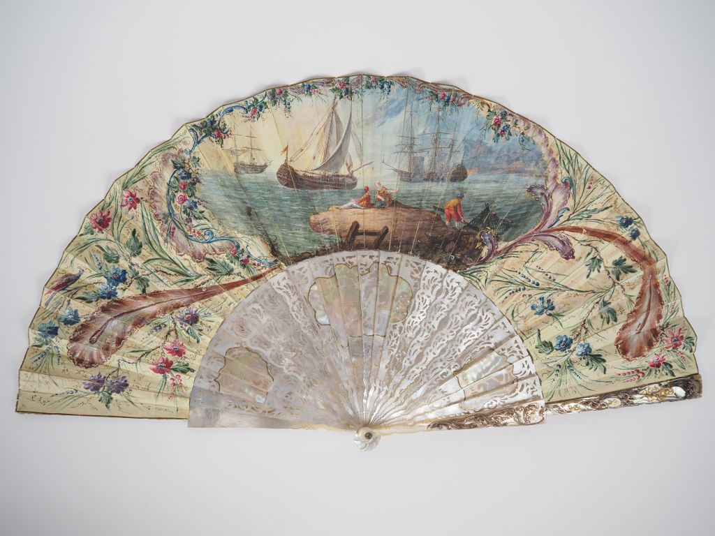 Eventail XVIIIème en nacre ajourée, dorée et argentée. Trois réserves en burgot à décor de personnages. Décor gouaché de marine et de scène mythologique. (Un manque sur un des brins). Dans un étui d'époque en mauvais état.