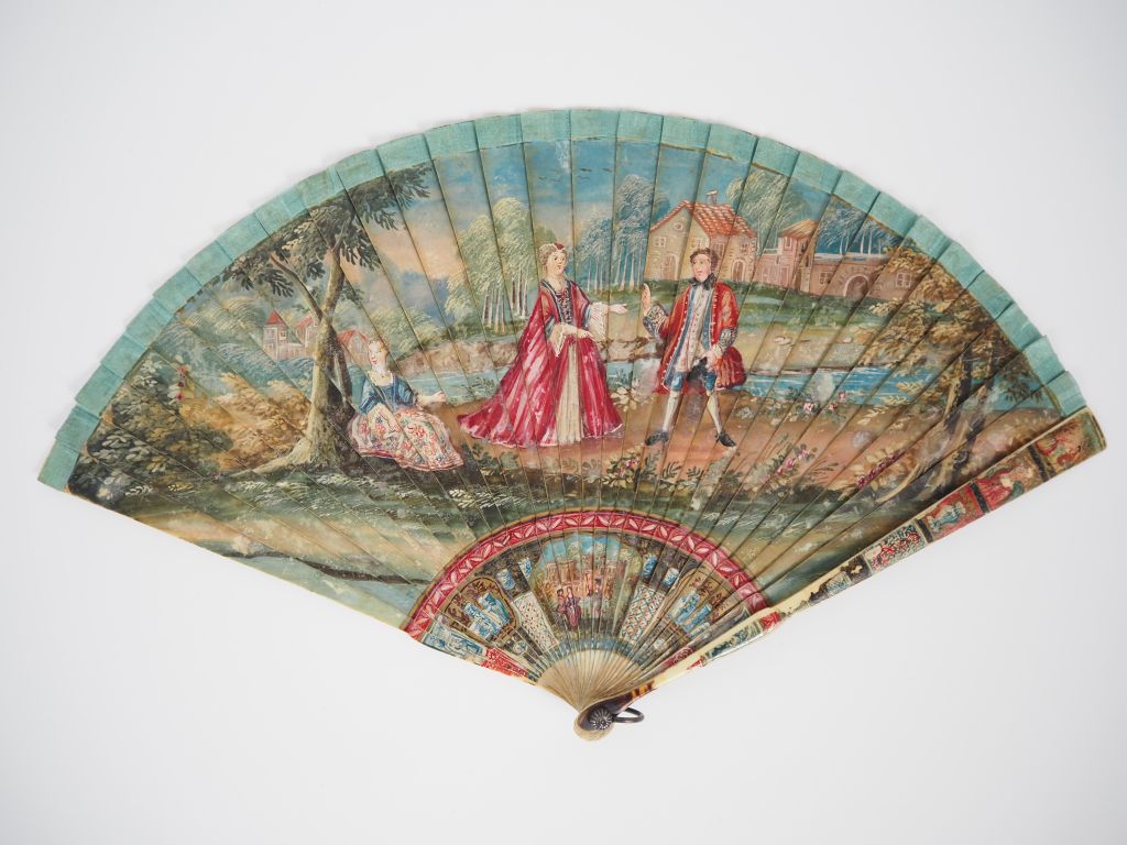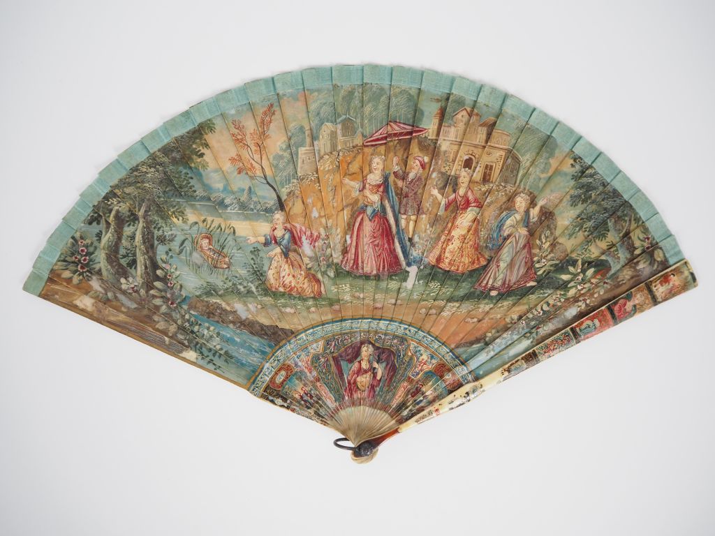 Eventail XVIIIème. Ivoire brisé, Vernis Martin double face, au recto "Moïse sauvé des eaux", au verso "scène champêtre avec trois personnages". 22 cm. CITES.