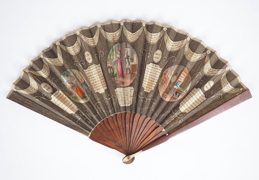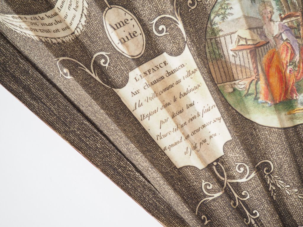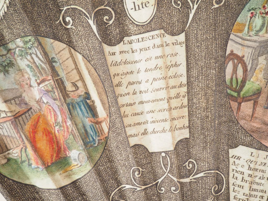 Eventail XVIIIème. Monture à 20 brins en palissandre. Feuille lithographiée à décor de couplets, charades. Amitié, fidélité, sincérité, humanité, l'enfance, l'adolescence,âge mûr, vieillesse et de 3 médaillons peints intitulés: enfance, jeunesse, vieillesse.