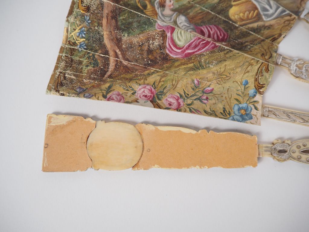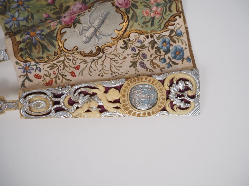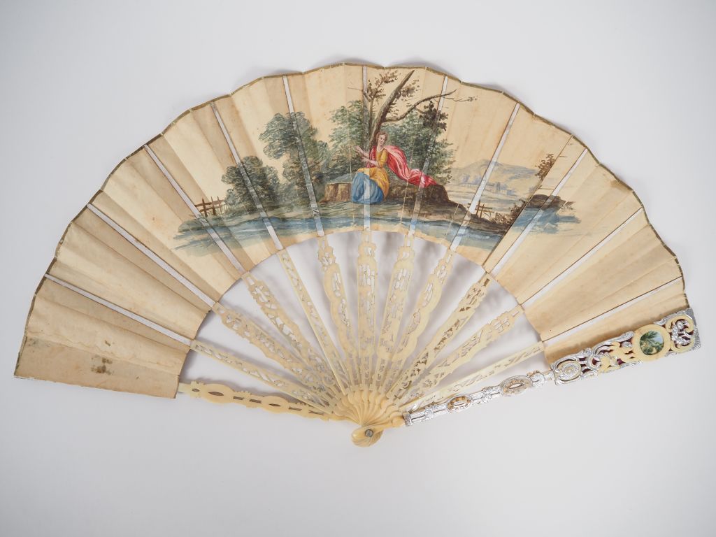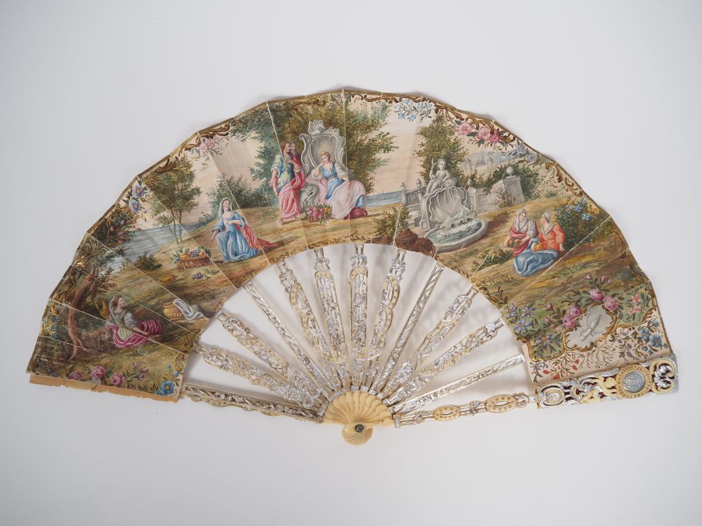 Eventail XVIIIème. Monture ivoire 12 brins + 2 gravée, sculptée, repercée et rehaussée d'argent, 4 brins centraux forment un médaillon central et médaillons sur verre à décor d'angelots. Maitres brins avec angelot et rinceaux. Autel de l'amour en argent. Feuille gouachée sur vélin à décor d'une déclaration d'amour dans un parc et château. (accidents). CITES