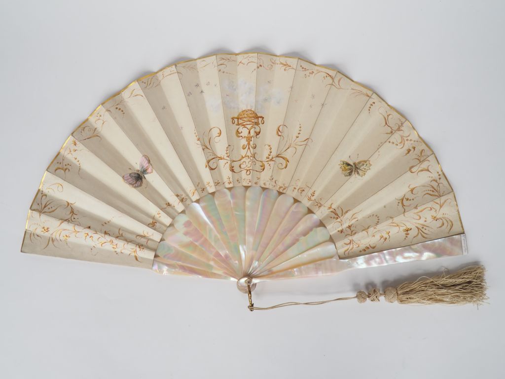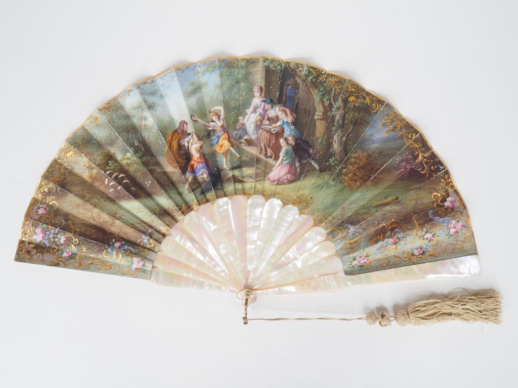 Eventail XVIIIème "squelette". Monture ivoire 12 brins ciselée, repercée et réhaussée d'or et d'argent. Feuille plein vol, gouachée. Grand cartouche central "scène familiale autour d'un enfant". Deux médaillons avec un chien, deux médaillons avec nature morte. Deux médaillons avec personnage. Feuille fond argenté à décor de guirlandes fleuries et papillons. CITES.