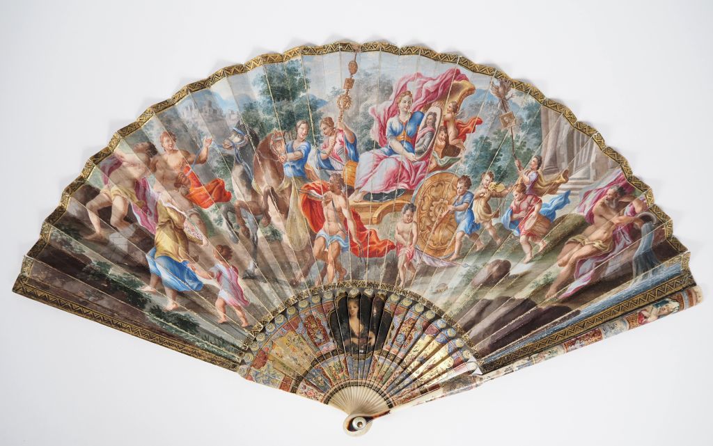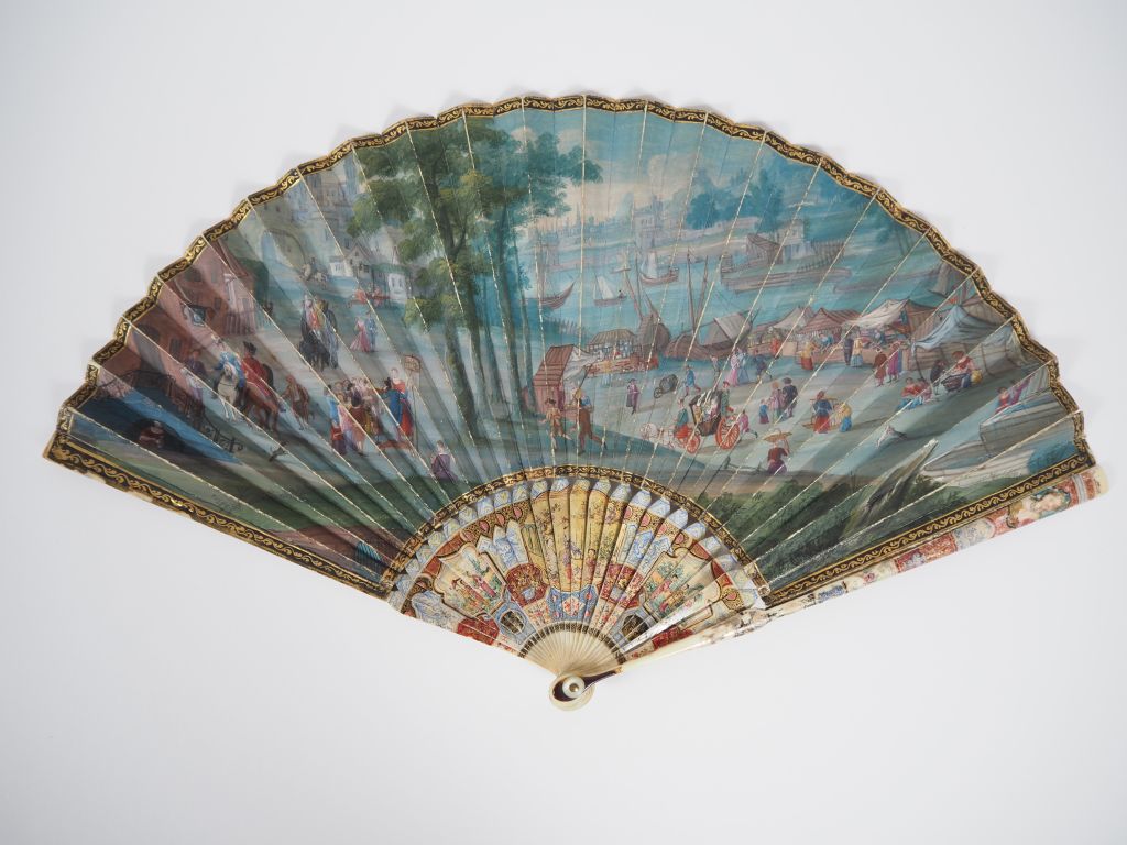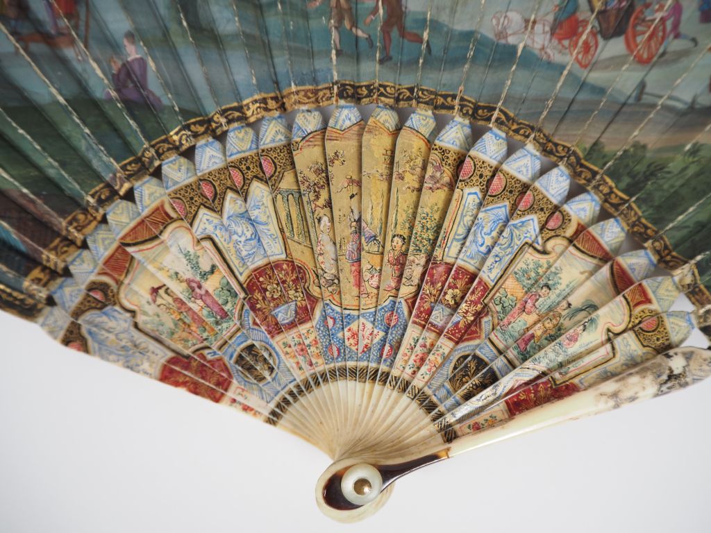 Magnifique éventail en ivoire polychrome à décor d'élégantes dans trois réserves et de motifs chinoisant. Gouache figurant une scène mythologique et un grand paysage animé. (Quelques usures). CITES.
