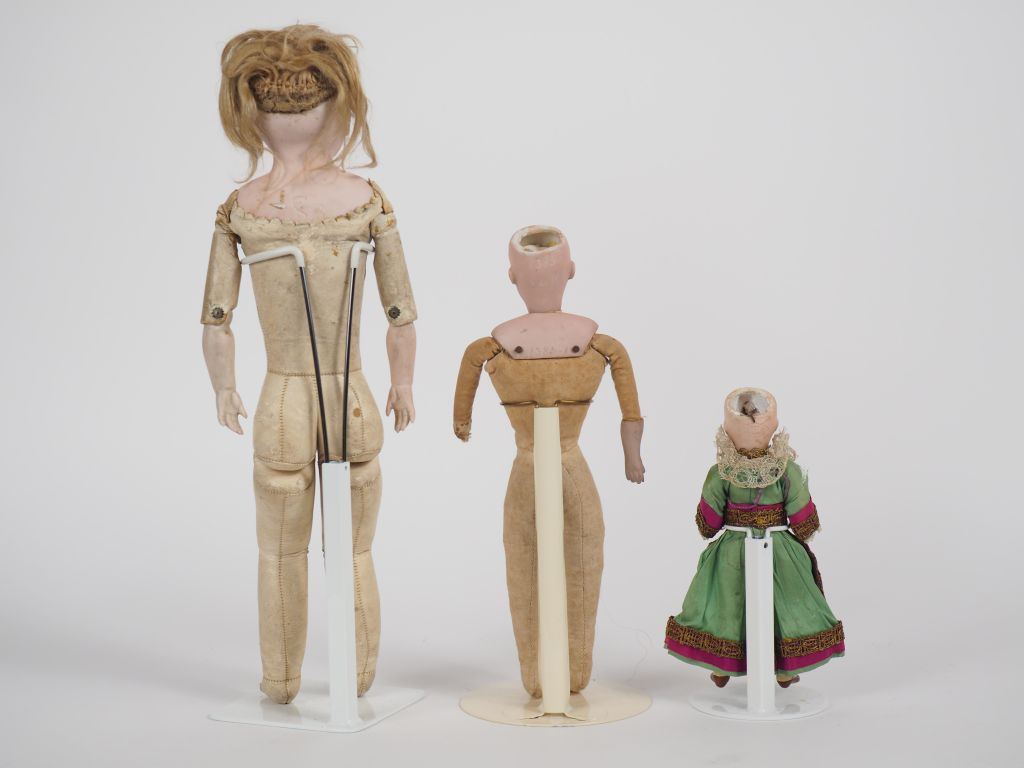 2 poupées dont : mignonette unis France corps compo, tête buste S/H 1038 montée sur corps tissus, manque une main porcelaine, tête buste accidenté allemande montée sur corps cuir mains porcelaine