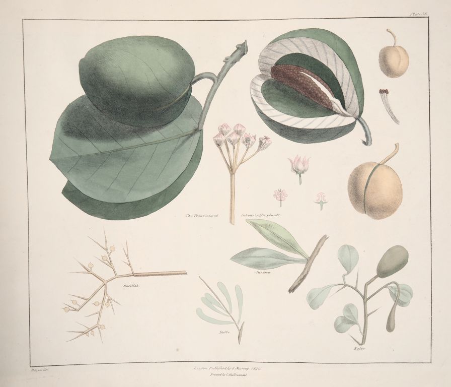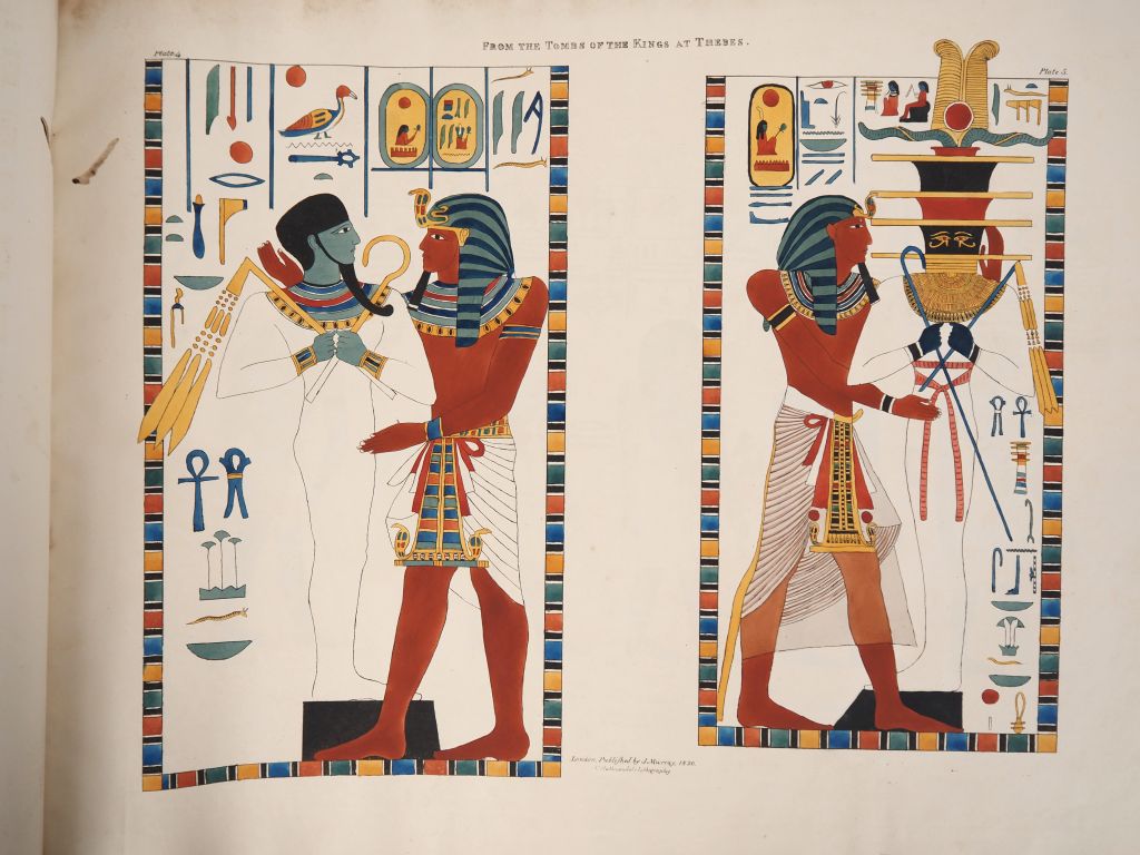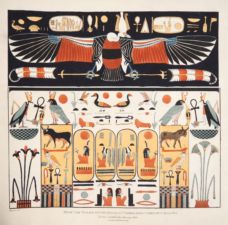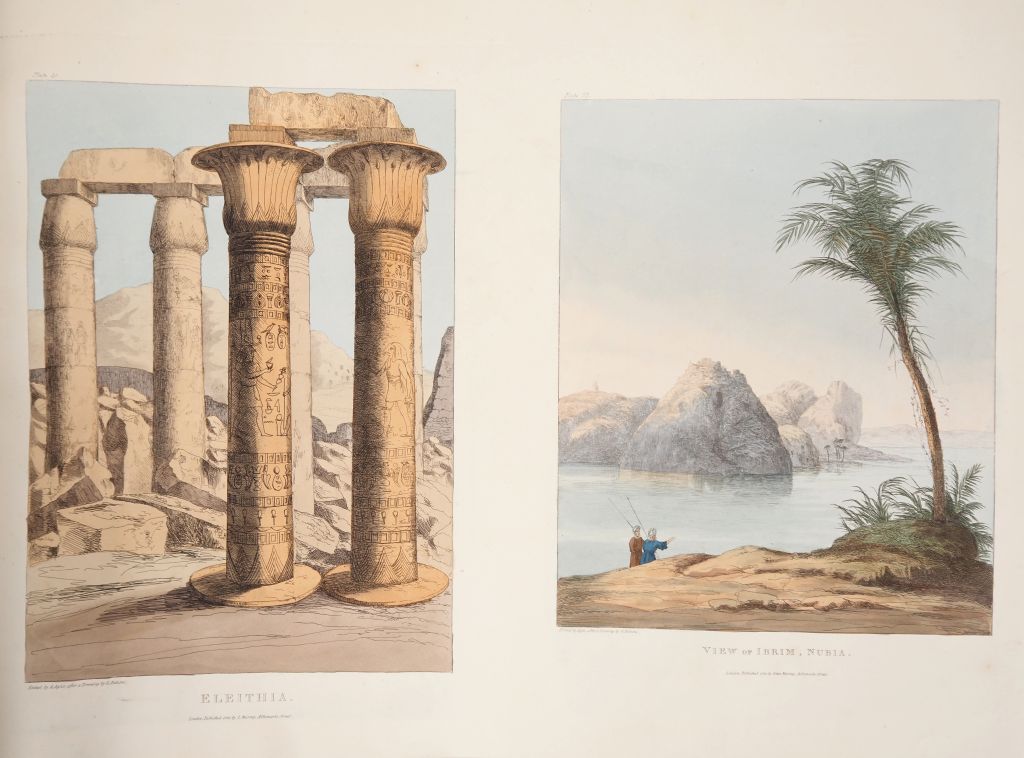 [ATLAS]. BELZONI (G.). ATLAS DES VOYAGES, RECHERCHES ET DÉCOUVERTES DE G. BELZONI EN ÉGYPTE ET EN NUBIE traduits de l’anglais par G. B. Depping. Paris, Librairie française et étrangère de Galignani, 1821. In-folio à l’italienne (61 X 50 cm environ) reliure d’attente cartonnée, dos toilé, étiquette de titre papier imprimée au 1er plat , (1) f. blanc, (2) ff. de titre et explication des planches, 34 planches. Cartonnage défraichi avec mouillures et manques de papier, plats voilés, petit travail de ver en fond de cahier avec 2 ou 3 minimes atteintes aux gravures, des salissures, essentiellement dans les marges. ÉDITION ORIGINALE de ce TRÈS RARE ET BEL ATLAS comportant 44 VUES lithographiées ou gravées à l’eau-forte, et enluminées , elles sont réparties sur 34 planches, certaines dépliantes : peintures et sculptures trouvées dans les temples, pyramides, tombes, vues pittoresques, antiquités, plantes, coupes et plans des édifices anciens, etc. Cet atlas complète les 2 tomes de texte in-8 parus en 1821 sous le titre "Voyages en Égypte et en Nubie contenant le récit des recherches et découvertes archéologiques faites dans les pyramides, temples, ruines et tombes de ces pays, suivis d’un voyage sur la côte de la mer Rouge". Comme le précise une note de l’"explication des planches" de l’atlas : « Les planches ayant été exécutées et enluminées en Angleterre, sous les yeux de l’auteur, qui a voulu donner à ces figures la plus grande exactitude, ne portent que des légendes anglaises. On en trouvera l’explication [en français] dans la table suivante. » Le cartonnage est défraichi mais les planches sont généralement en bel état, avec des coloris vifs et des atteintes essentiellement dans les marges (travail de ver et salissures). ¶ Chadenat, 514, pour le texte mais ne mentionne pas l’atlas – Gay, 1940, qui évoque cet atlas avec titre en français comme le complément d’une édition anglaise – Hage-Chahine, 399, pour le texte mais ne mentionne pas l’atlas.