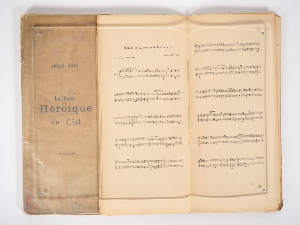 BOIS (Jules). LA PORTE HÉROÏQUE DU CIEL. P., Librairie de l’Art Indépendant, 1894. Deux volumes brochés, grand in-8 étroit. 1er volume : fentes et manques au dos, mouillures aux plats, taches claires en marge du feuillet de dédicace – 2nd volume : dos doublé, mouillures claires aux plats. ÉDITION ORIGINALE rare de ce drame ésotérique en vers qui contient 2 DESSINS à pleine page d’Antoine de LA ROCHEFOUCAULD, dédicataire de l’ouvrage et un prélude d’Érik SATIE. 2 EXEMPLAIRES. ¶ Caillet, 1343 – Dorbon, 5487.