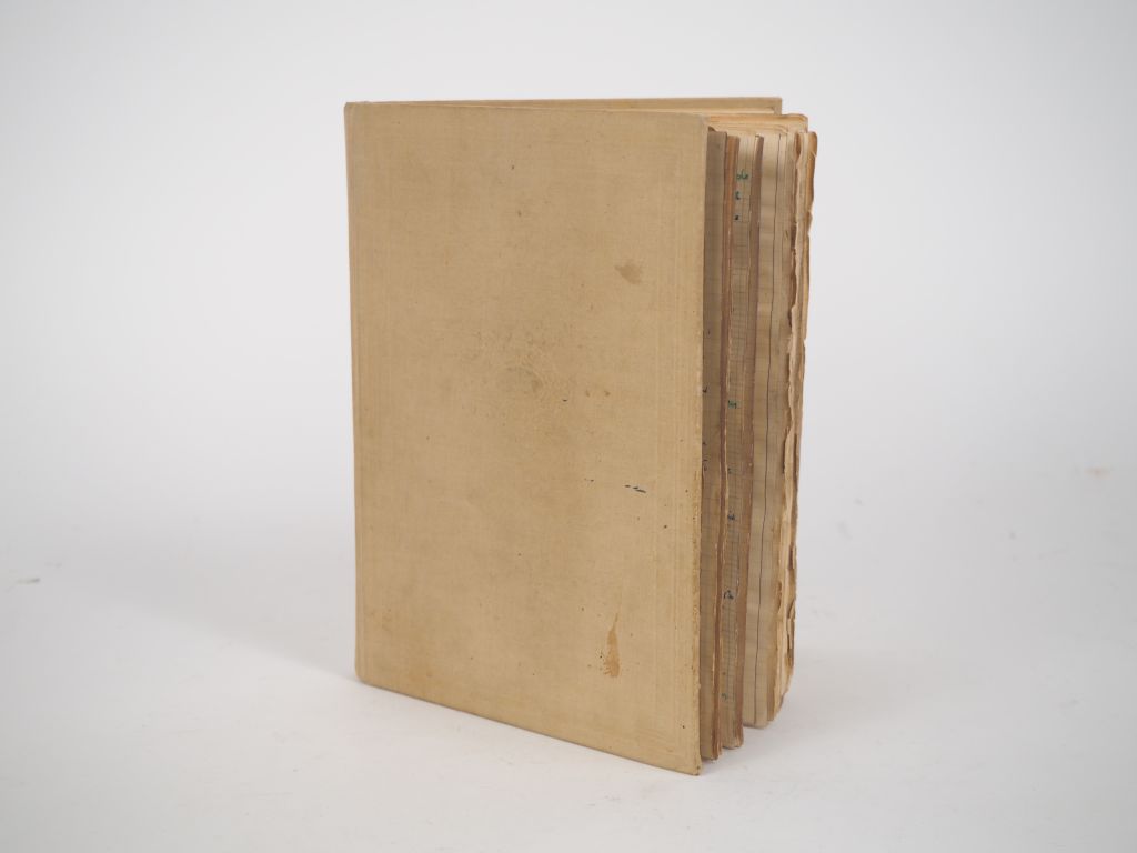 BOUSQUET (Joë). LE PASSEUR S’EST ENDORMI. Cahier in-4 toile gris clair, encadrement de filets et fleuron central à froid au 1er plat, dos lisse muet , 73 ff. [et des ff. blancs], notes manuscrites au verso du dernier feuillet. IMPORTANT MANUSCRIT DE TRAVAIL DE LA QUATRIÈME ET DERNIÈRE PARTIE DU ROMAN DE JOË BOUSQUET PUBLIÉ CHEZ DENOËL EN 1939. Ce manuscrit de 82 pages (dont les 50 premières seulement sont numérotées) est celui du texte définitif , quelques infimes changements et une variante notable cependant page 4 et 14 du manuscrit, où la mention du peintre « Paul Klee » a été remplacée dans la version imprimée par celle de « [Wolfgang] Paalen ». Rédigé à l’encre en bleu-vert et bleu, ce manuscrit contient de nombreux cartons, corrections, biffures, repentirs, ajouts, des pages entières biffées, ainsi que quelques pages coupées que l’écrivain a fait disparaitre sciemment, probablement pour conserver l’unité d’un manuscrit dont il souhaitait qu’il fixe le texte définitif. Cette quatrième et dernière partie contient 9 chapitres numérotés de « I » à « IX » dans la version imprimée, mais bien qu’ils soient constitués et annoncés neuf fois « chapitre » dans cette version manuscrite ils ne sont pas numérotés. Les premières gardes du cahier contiennent de nombreuses notes manuscrites de Bousquet : « Abus de conscience » - « Samedi / Agrafer au dernier chapitre du cahier vert l’annonce de ma thèse matérialiste dont les assises apparaissent dans le carnet brun / Par des répliques, y faire vivre l’incident de l’incendie : Bemolle me demande s’il est vrai que j’ai failli brûler / Y préparer la révélation du réel, qui sera éclairée par le passage de Mygale / Ne pas achever cette partie sans relire de la 1ère partie / Et en même temps, lire du Van Gogh – du Ste Beuve – du Faust / Penser à introduire l’incident de l’officier et Solger ». Sur le dernier feuillet blanc l’écrivain a écrit : « Alban Berg / Bertok [sic, pour "Bartók"] », puis à l’encre rouge : « maintenant qu’entre ses yeux et le jour il n’y a plus rien de ce qui est un poids si lourd à porter / quand il n’y a que les larmes pour nous le rendre qu’elles le contournent tout entier tellement il était pur et fidèle ». En regard du début du chapitre 9 Bousquet a biffé un texte intitulé « Plan / récit de Bémolle / récit de Mygale : sépulture – vente des livres / Fixés sur le sort du carillonneur / Aimé – Sébastien / Introduire la rêverie invisible / Introduire la lettre sur l’Art. » MAGNIFIQUE DOCUMENT. ¶ René Nelli, préface au t. II de l’Œuvre romanesque complète, p. 14, Albin Michel, 1979.