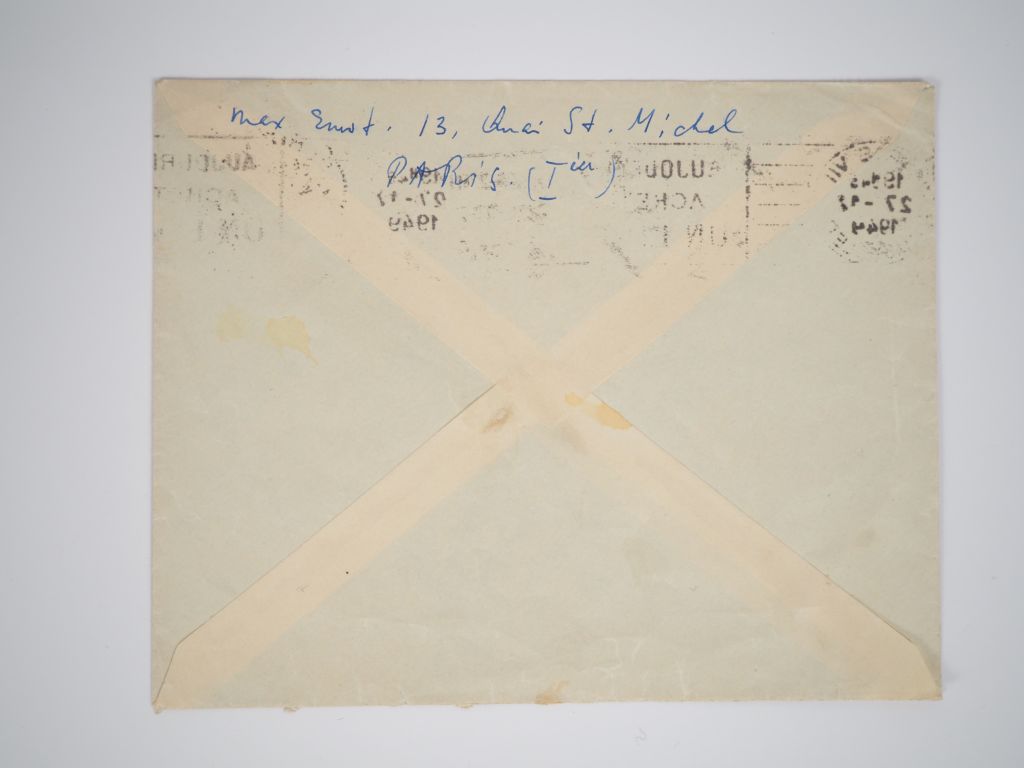 ERNST (M.). LETTRE AUTOGRAPHE signée adressée aux Ducellier. Une page sur un feuillet (269 X 207 mm) à en-tête manuscrit « 13, Quai Saint-Michel / PARIS (Iier) / Dec. 27. [19]49 » avec enveloppe timbrée. LETTRE DANS LAQUELLE MAX ERNST SE PLAINT DE NE PAS RECEVOIR DE NOUVELLES DE SES AMIS. Il ÉVOQUE SA COLLABORATION AVEC JOË BOUSQUET ["Partitions", ouvrage illustré de 23 dessins originaux de Max Ernst qui paraîtra en 1950 aux Éditions Jacques Damase et Full Score]. « Mon cher James et chère Jeanne, Nous sommes troublés et un peu triste aussi de ne pas avoir eu de vos nouvelles et de ne pas avoir vu James au moins une fois pendant un de ses séjours à Paris que nous supposons d’être assez nombreux. Que se passe-t-il ? Aurions-nous fait quelque chose pour vous déplaire ???? – De Joe [Bousquet] non plus, aucune nouvelle. J’espère qu’il n’est pas malade de nouveau. Jacques Damase (qui s’occupe du livre que Joe et moi ont [sic] fait ensemble) me dit qu’il a envoyé les épreuves à Joe, il y a 6 ou 7 semaines déjà, et qu’il n’attend que le bon à tirer de Joe pour en terminer. Le silence de Joe m’inquiète. Dites-moi ce qui en est la cause. – Pourriez-vous dire à Joe que la librairie "La Hune" (à côté des 2 Magots) va ouvrir une exposition de tous les livres que j’ai illustrés, le 13 janvier 1950, et que notre livre pourrait y figurer, s’il envoie les corrections maintenant. – Si vous venez à Paris, venez nous voir. Tel. Opera 5739. Adr. 252, rue de Rivoli (Iier). On me trouve aussi tous les jours (après midi) dans mon atelier 13, Quai St. Michel (5e étage à gauche). J’aurais pas mal de nouvelles choses à vous montrer. Très affectueusement comme toujours. Max. »