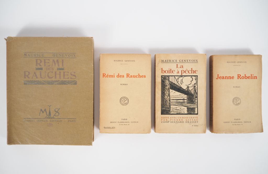 GENEVOIX (Maurice). 4 OUVRAGES (3 avec E.A.S., 1 signé). - JEANNE ROBELIN. Roman. P., Flammarion, 1920. In-12 broché. Dos bruni. E.A.S. : « à Madame Ducellier, respectueux hommage. Maurice Genevoix ». - RÉMI DES RAUCHES. Roman. P., Flammarion, 1922. In-12 broché. Dos bruni avec petits manques. Signature autographe de l’auteur sur le faux-titre. - RÉMI DES RAUCHES. Roman. P., Marcel Seheur, 1926. In-4 broché. Édition illustrée de bois gravés de Deslignières. UN des 400 exemplaires numérotés sur vélin d’Arches. E.A.S. : « Pour Monsieur James Ducellier, cordial hommage. Maurice Genevoix ». - LA BOÎTE À PÊCHE. P., Grasset, 1926. In-12 broché. Mention fictive de « 9e édition » au 1er plat de la couverture. Dos légèrement bruni. E.A.S. : « à Madame Ducellier, respectueux hommage d’un presque compatriote. Maurice Genevoix ».