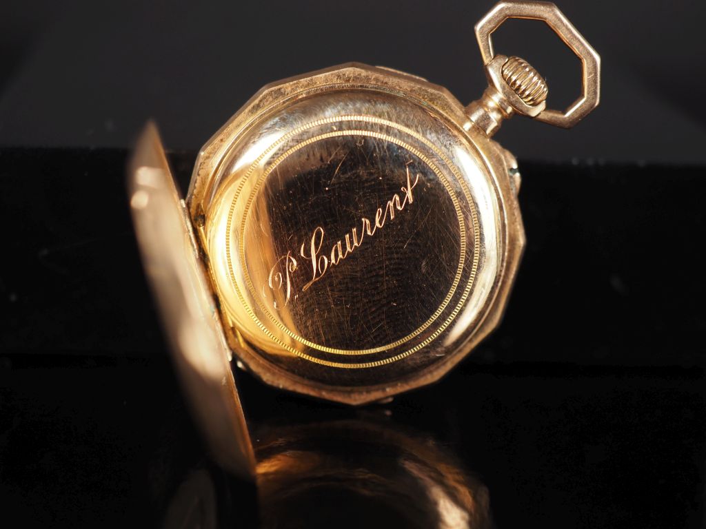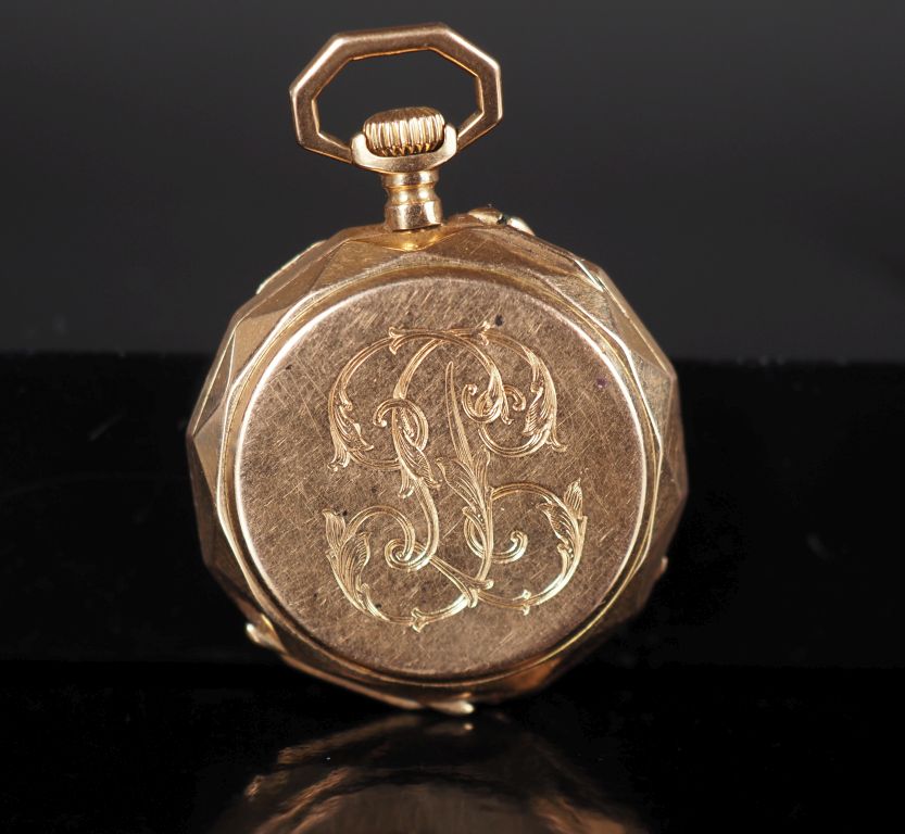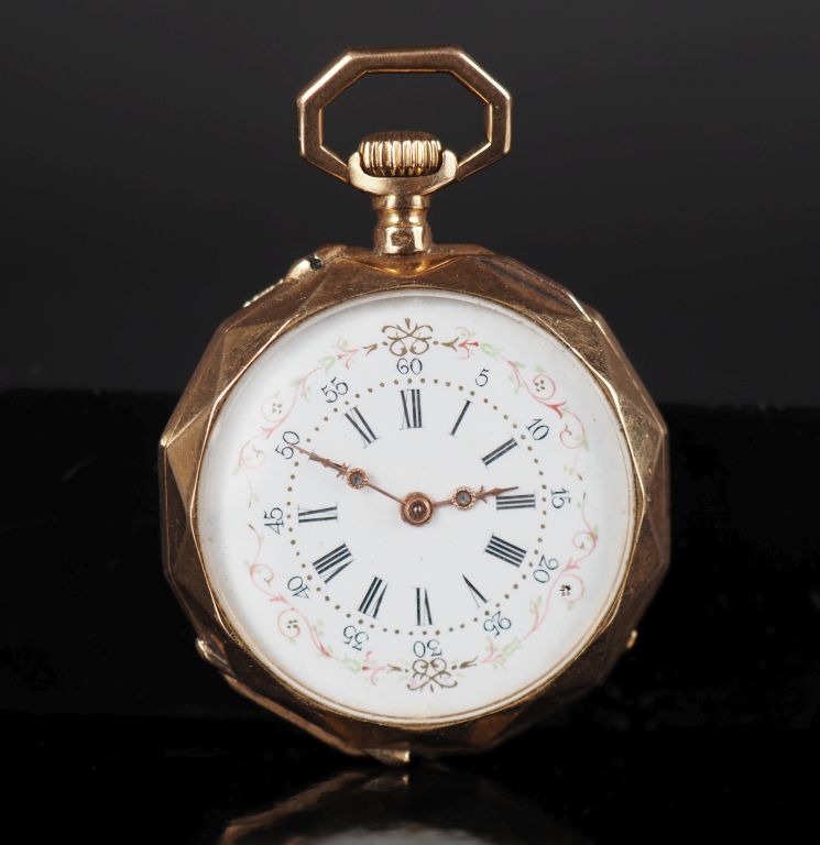 Montre de col Napoléon III en or jaune 750. Cadran à chiffres romains pour les heures et arabes pour les minutes, agrémenté d'arabesques polychromes. Joli pourtour facetté. Le revers, à décor de monogramme. Double fonds en or jaune 750. Diam. 3 cm Poids tel. 21,45 g