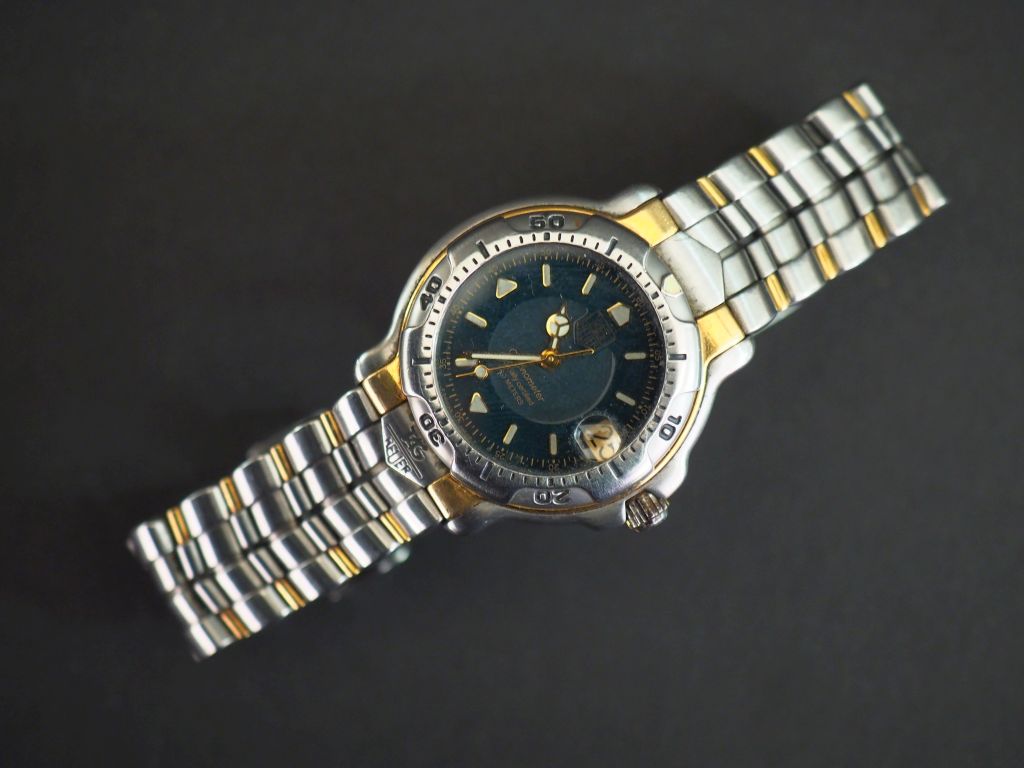 TAG HEUER, Chronometer Montre bracelet d'homme en acier. Boitier à lunette graduée. Cadran rond à index bâtons luminescents pour les heures. Guichet dateur à 3h. Aiguilles luminescentes. Bracelet articulé en métal et métal doré, boucle déployante. Signée. Numérotée. Diam. 33 mm