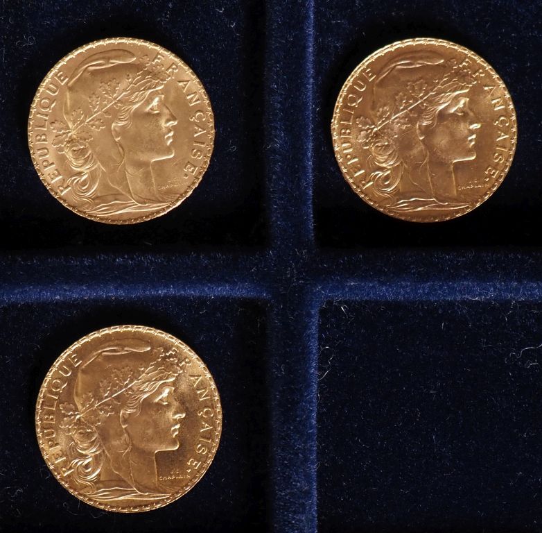 Trois pièces de 20 Francs or, 1910. FRAIS ACHETEURS 10% HT.