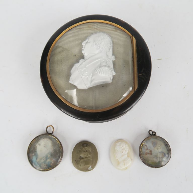 Boite ornée sur le couvercle d’un profil en cristallocérame du Roi Louis XVIII, ouvrant, monté à charnière, présenté sur fond de moire, signé « DESPREZ RUE DES RECOLETS n°2 A PARIS » A.B.E. (Traces d’insecte) Diam : 7 cm. On y joint quatre médaillons (usures) représentant le Roi Louis XVIII, le duc de Bordeaux ou Louis XVII.