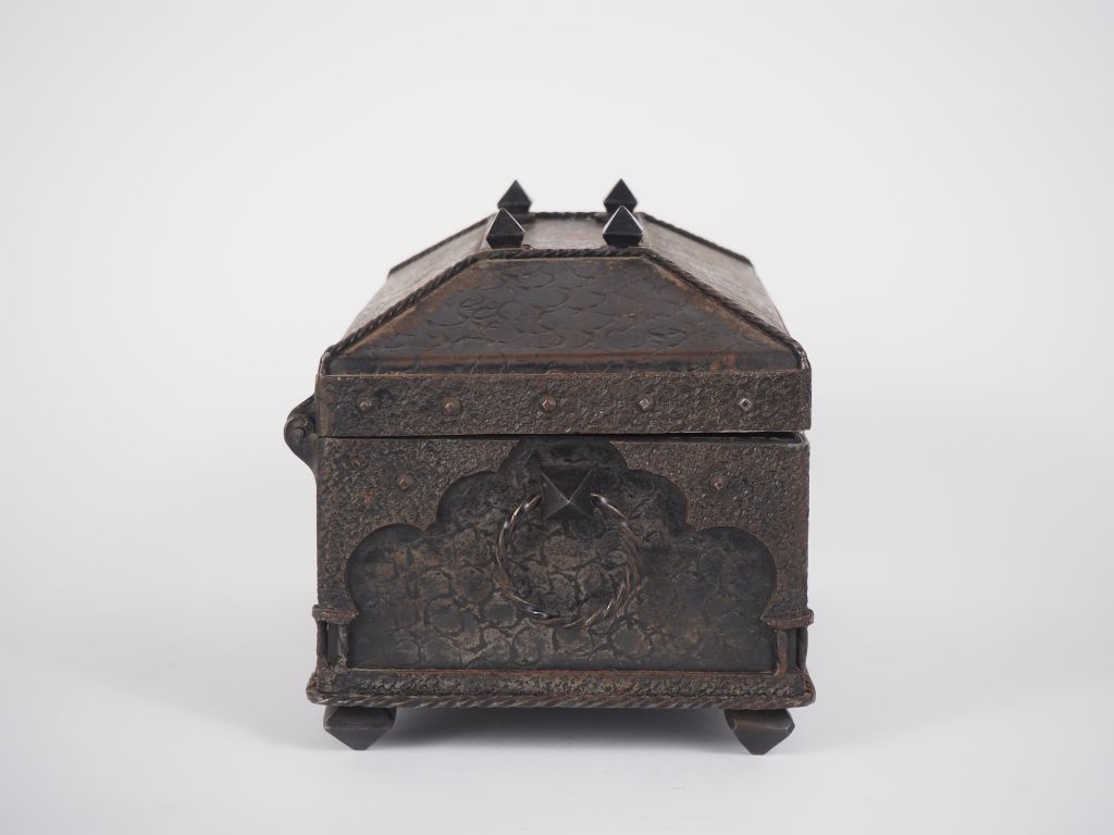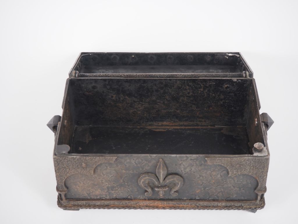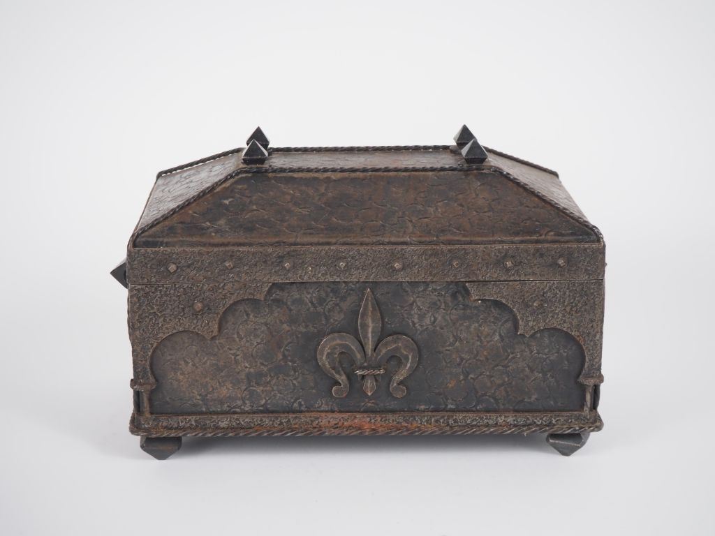 Cassette de style Haute Epoque en fer à décor de fleur de Lys. Dim. 16 x 24,5 x 15,5 cm